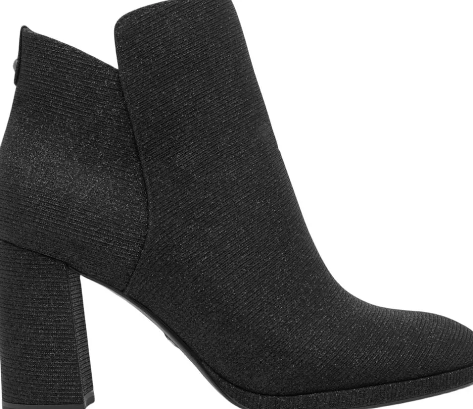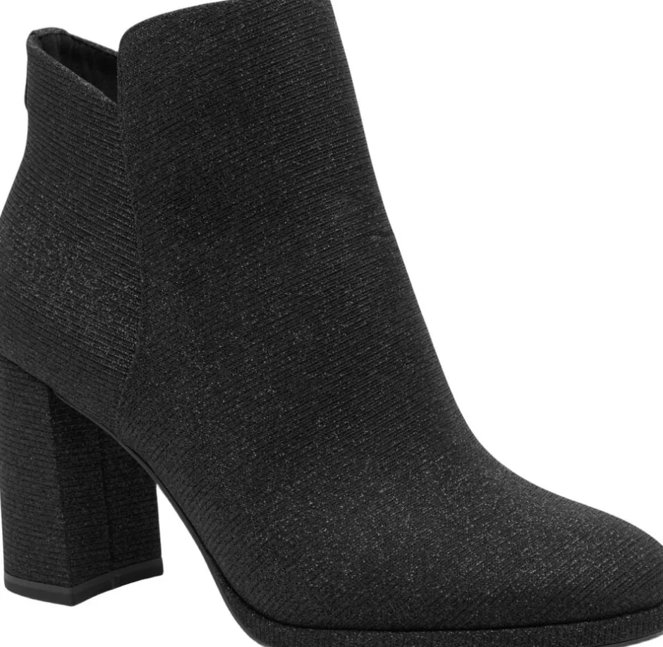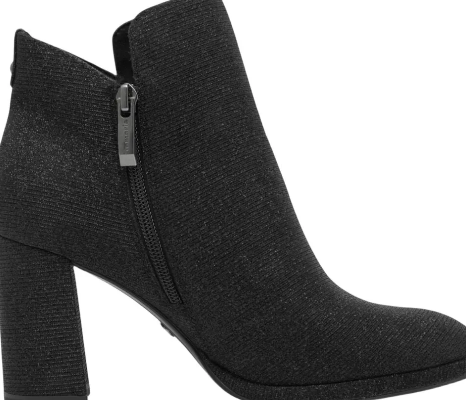 Kort let støvle i sort glitter tekstil materiale. Blokhæl på 80mm skafthøjde på 10 cm. Indvendig lynlås og der er antislide og antichok i hælen samt Touch it effekt i dæksålen