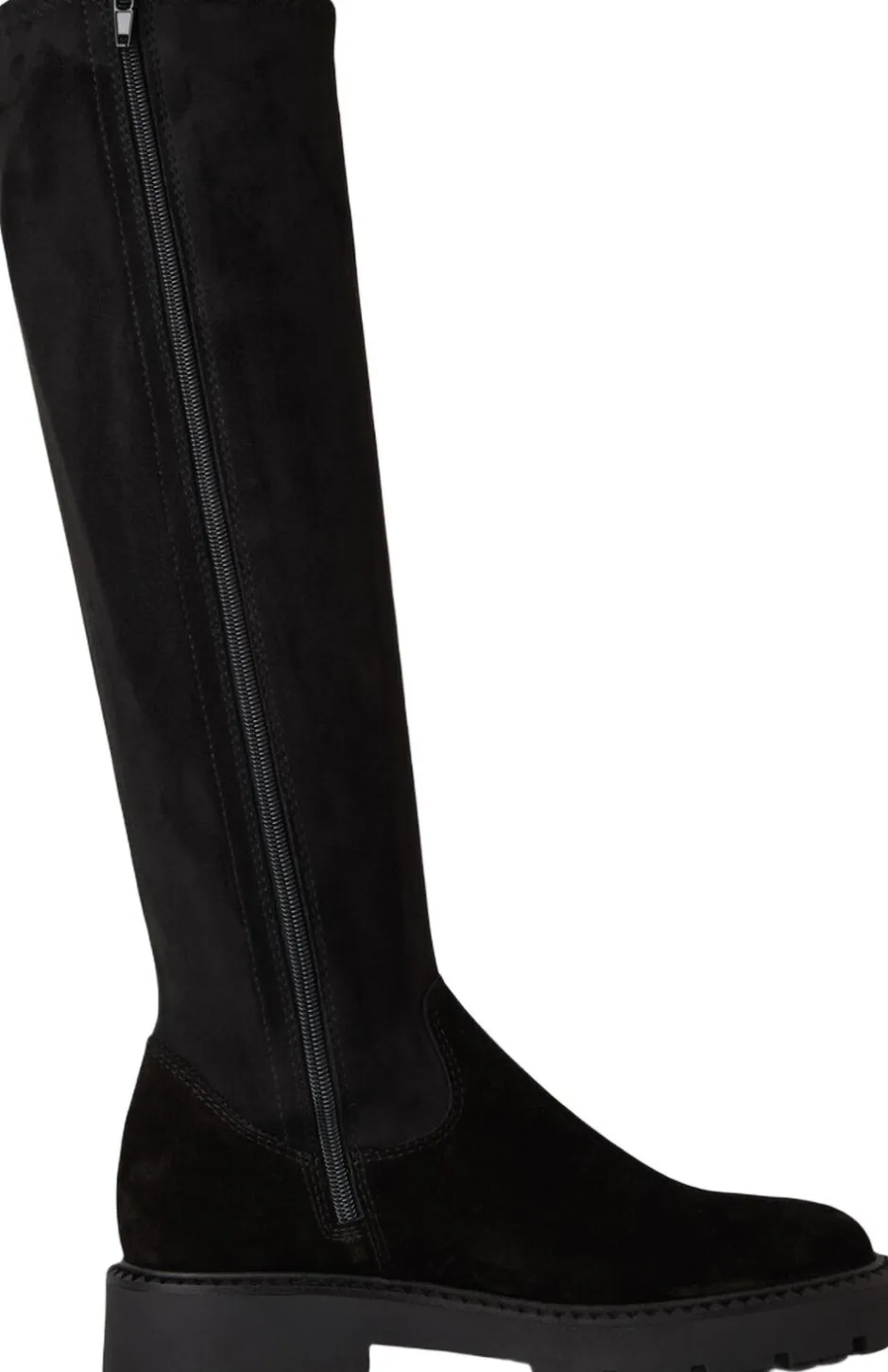 Langskaftet stretchstøvle med ruskind i foden. På en profil sål. Indvendig lynlås og skafthøjden 43 og hælhøjden 45 mm