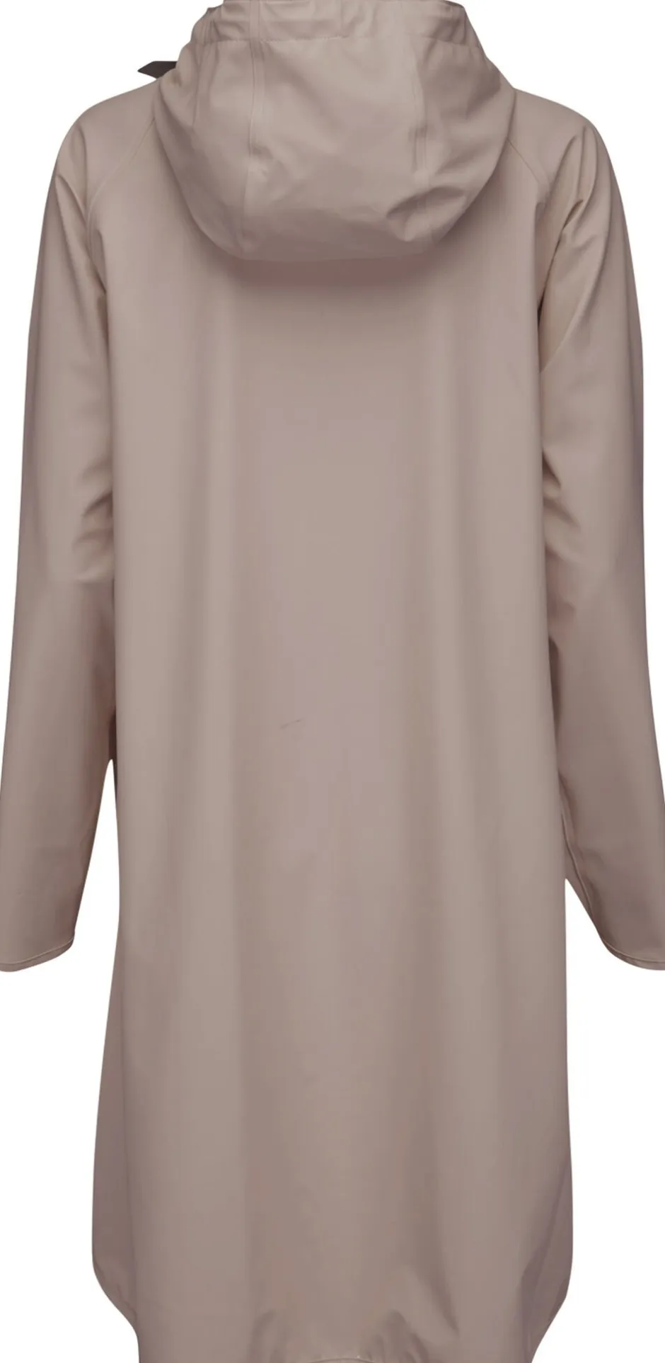 Den ikoniske ILSE JACOBSEN-stil RAIN71 er en feminin A-formet regnfrakke lavet i et let og diskret vandtæt gummieret PU-stof med en trikotbagside. Funktionerne omfatter svejsede sømme, en aftagelig hætte med strop i kunstlæder, slidser i sidesømme og YKK 2-vejs lynlåslukning med storm foran. Regnfrakken har et diskret IJH-logo præget på venstre ærme. En vandtæt klassificering på 5000 mm vil være nok til mellemstore til tunge brusere.