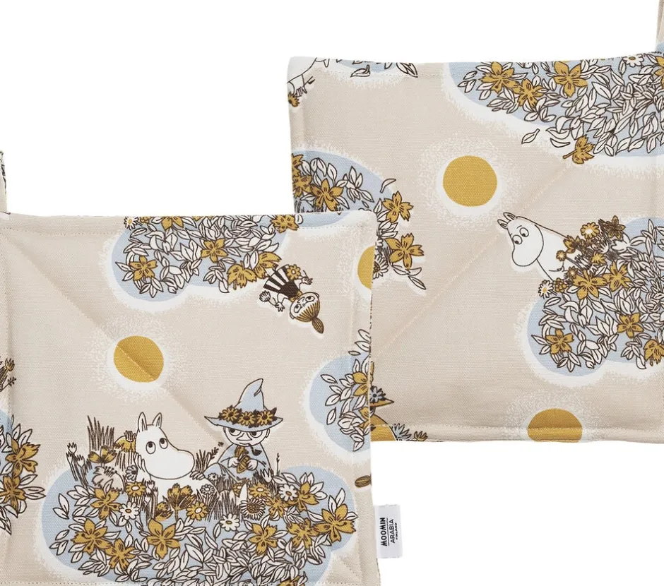 Brænd ikke dine poter! Venner for evigt køkkentekstilerne har skylignende form og gør de daglige gøremål til en leg. De er perfekte til køkkeneventyr! Moomin Arabia grydelapper 22×22 cm, Venner for evigt