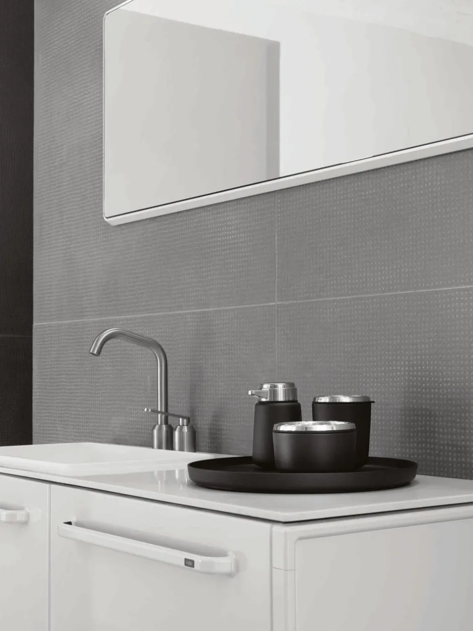 Vipp tandbørstekruset er designet med en todelt gummiindsats og en skridsikker gummibund, der beskytter overflader. Alle gummidele kan rengøres i opvaskemaskinen. Materialevalg og formsprog matcher både sæbeskålen og sæbedispenseren og understreger det tydelige slægtskab på tværs af Vipp kollektionen. En af de vigtigste funktionaliteter ved designet af tandbørstekruset er, at man kan skille de enkelte elementer fra hinanden for praktisk og ordentlig rengøring. Samtidig vidner komponenternes indbyrdes pasning om et produkt, der er udført i gedigne kvalitetsmaterialer med lang levetid’ – Morten Bo Jensen, chefdesigner.