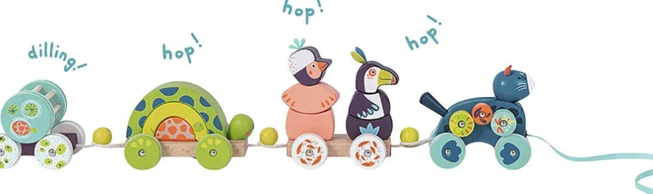 Aktivitetstog – Stort, i træ. Panteren trækker toget og kører sammen med sine venner, tukanen og koalaen, der kan sættes på togvognene. Der er også en skildpadde, som kan stables, og for enden af toget er der en rangle med kugler, som lave en lyd.