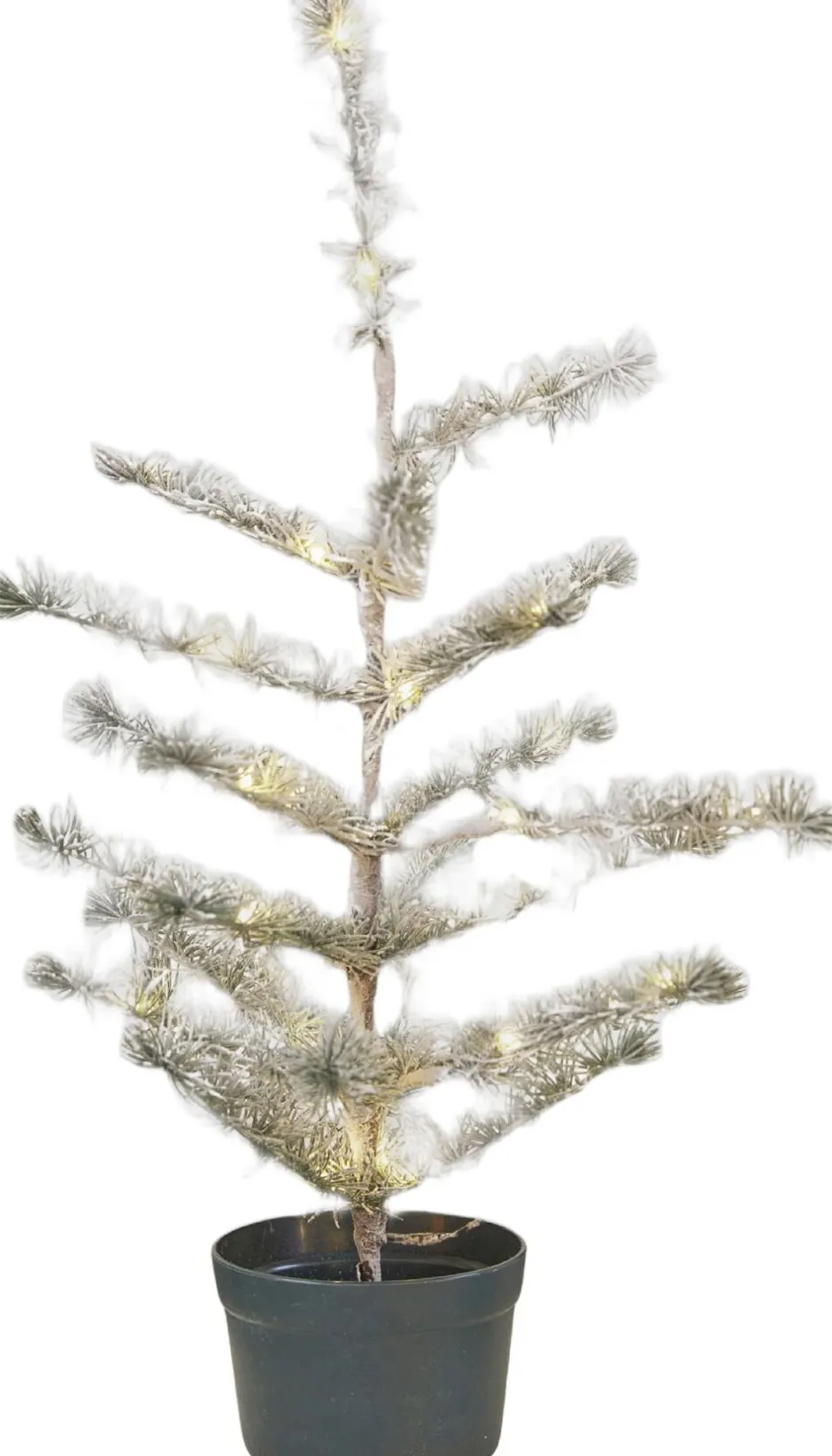 Klassisk cedertræ med et frostet look. Der er monteret lys på træet, som lyser med et varmt hvidt LED lys.