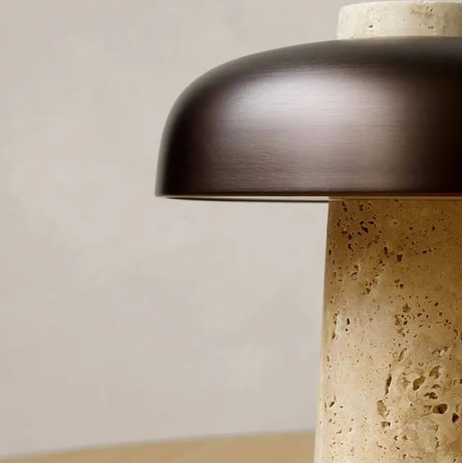 Foden på lampen er lavet i ubehandlet traverin, så den naturlige struktur fremgår. Selve skærmen som elegant hviler på travertin foden er lavet i bruneret aluminium.