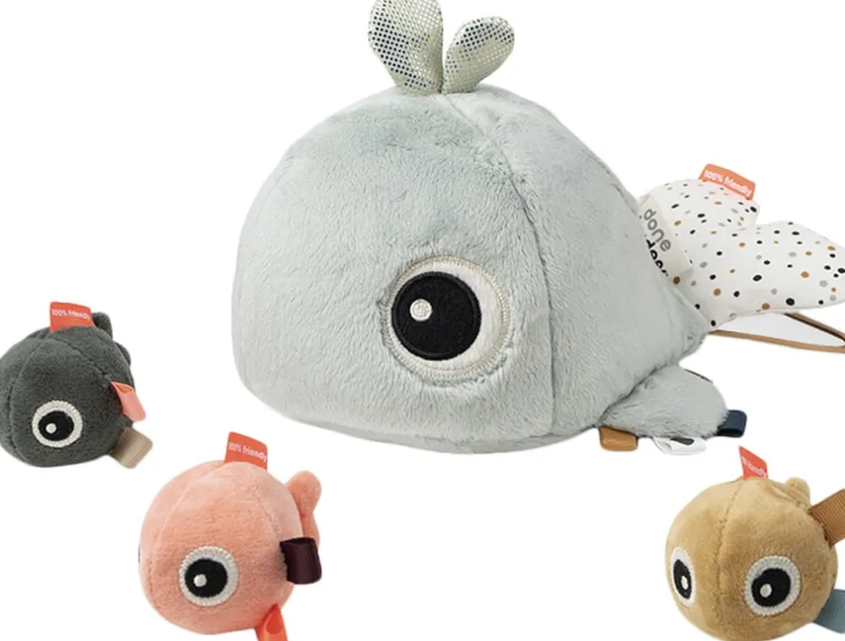 Den legesyge hval elsker at lege gemmeleg. Du skal være hurtigt for at følge med de små fiskevenner – de gemmer sig hurtigt inde i Wally. Hver fisk har sin egen lyd som vil give de små lyst til at kravle efter dem. De små kan opdage hvordan de søde fisk kommer ind og ud af Wallys mave, mærke de forskellige teksturer på den søde hval og opdage et skjult spejl under Wallys hale. De farverige mærker og søde dråber på Wallys hoved gør det svært at holde fingrene væk. Aktivitetslegetøjet vil underholde småbørn, mens de udvikler deres koncentrationsevner og hånd-øje-koordination. Den superbløde hval er mintblå og dens hale er dækket af spændende prikker. De små legesyge fiskevenner har hver sin farve.
