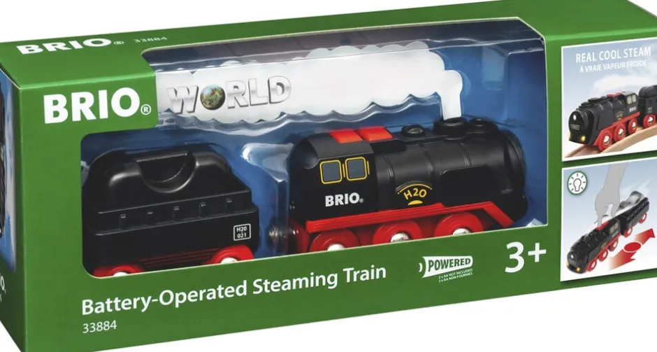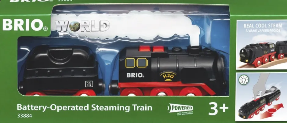 Fuld damp frem! Tøf afsted med din BRIO World togbane med realistiske dampeffekter i 33884 batteridrevet damplokomotiv Dette batteridrevne damplokomotiv udsender berøringssikker damp fra skorstenen, når det kører ud på skinnerne Når det er tømt for vand, kan du nemt genopfylde vognen, der trækkes efter toget Tryk på den røde fremad-knap ovenpå lokomotivet Forlygterne begynder at lyse, når dampen begynder at komme op, og du er klar igen til endnu et klassisk togbaneeventyr Bruger 2 stk AA batterier ikke incl Fra 3 år
