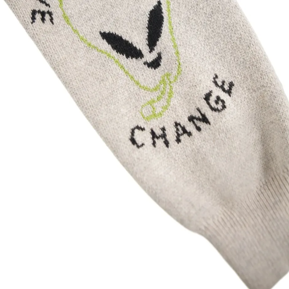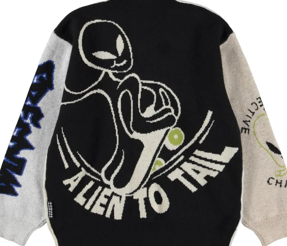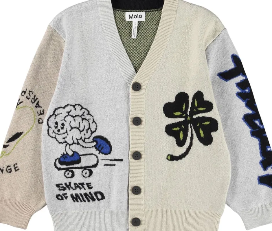 Denne multifarvede strikcardigan fra Molo er lavet i bomuld og uld og har en V-halsudskæring, knapper, ribstolpe og rib ved ærme og hofte. Cardiganen har en almindelig pasform og et mønster af forskellige grafik samt en stor alien bagpå.