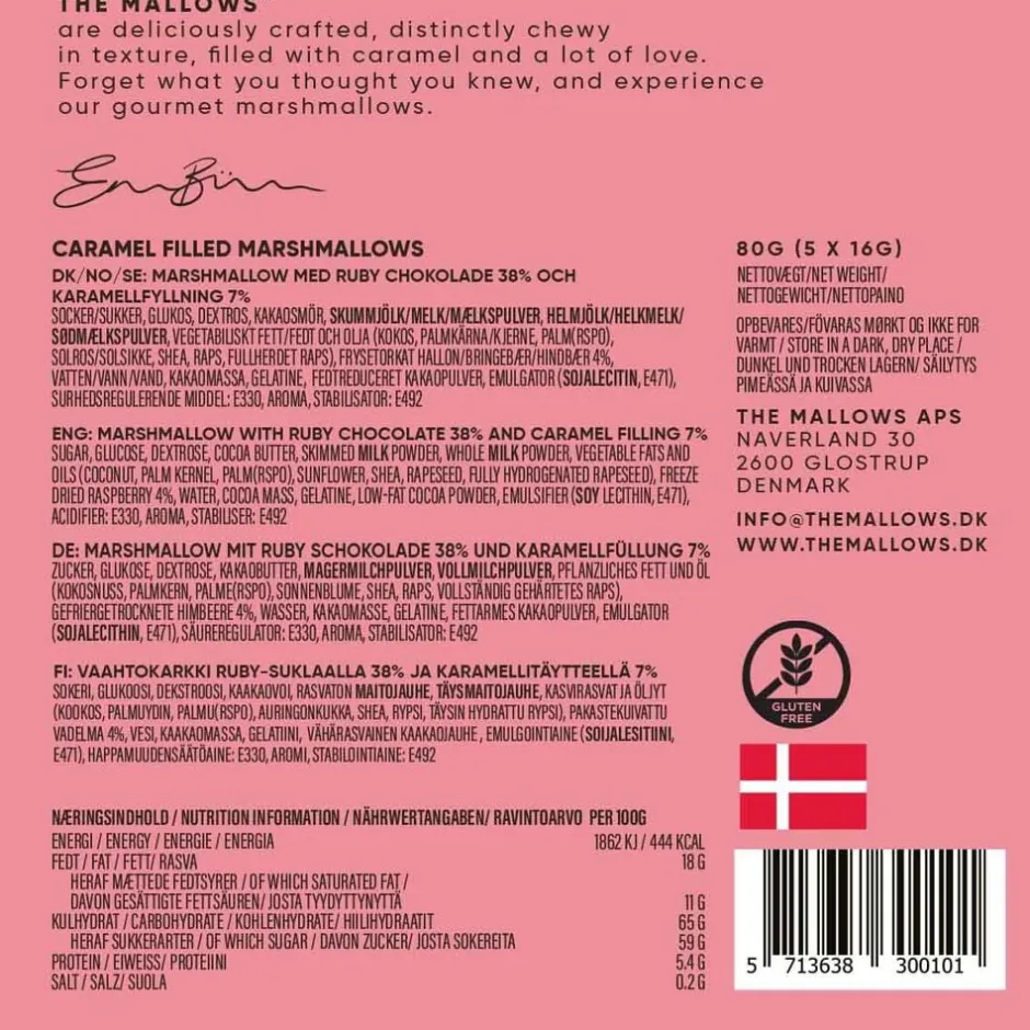 Ruby Chocolate + Rich Raspberry er karamelfyldte skumfiduser dragéret med frugtig ruby chokolade. Den søde kerne af karamel smelter sammen med vanilje skumfidusen ved første bid og er en perfekt modsætning til det friske hindbær og ruby chokoladen på overfladen.
