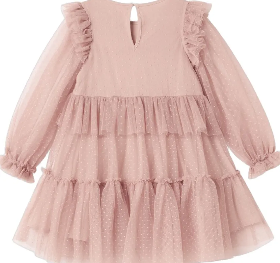 Langærmet kjole til børn med masser af volumen og flotte tylflæser. Kjolen er pyntet med prikker og har knaplukning bagpå. Kjolens længde går til over knæet.
