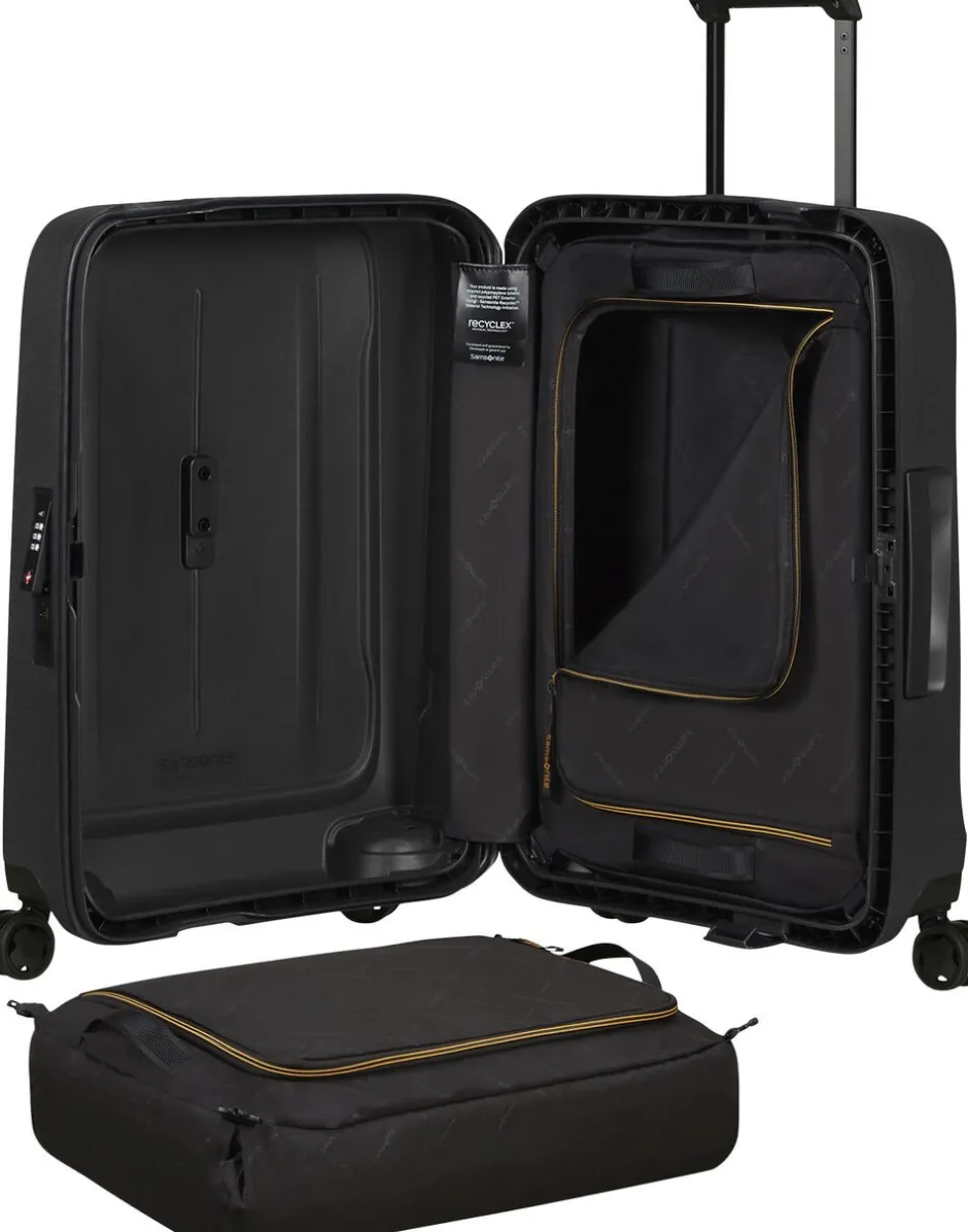 Kabinekuffert med 4 hjul, lavet af minimum 70% genbrugt polypropylen, stoffet indvendigt er lavet af genbrugte pet flasker,3 punkts TSA lås, dobbelt trollystativ, 2 aftagelige pakkeposer,2.6 kg,navneskilt,rumindhold 39 l, 5 års garanti