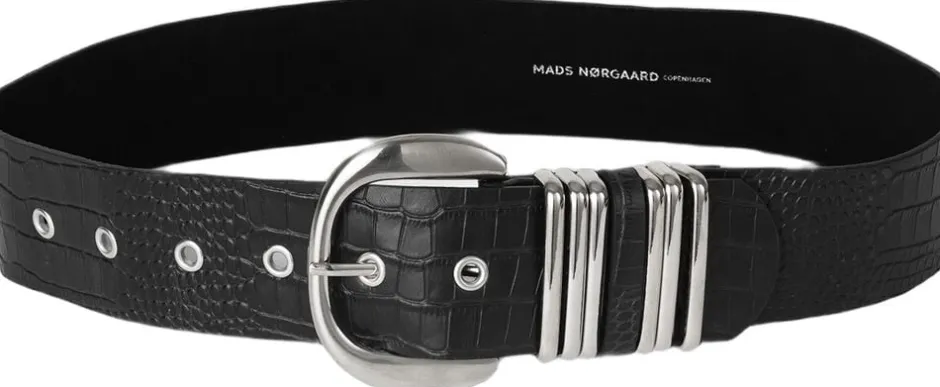 Bælte i reptilpræget læder med metalstropper og buet bæltespænde.