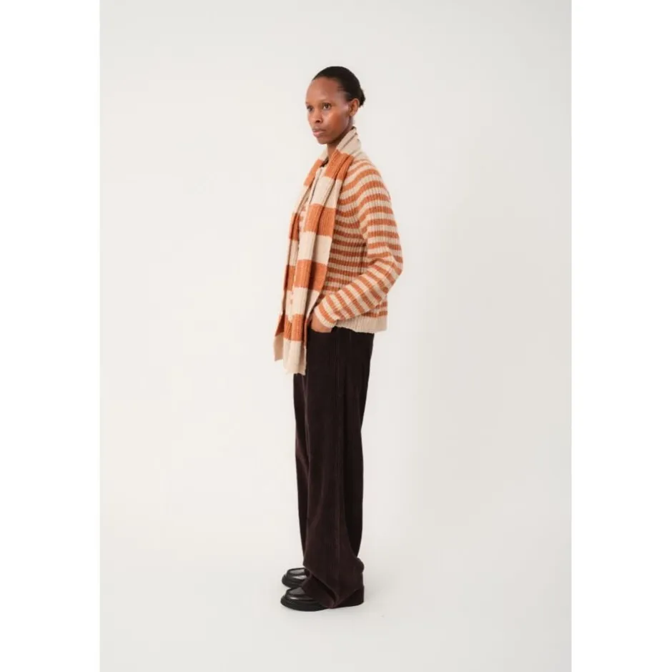 MountainLL tørklæde er en strikket klassiker med brede striber i enten mørkeblå eller rust kombineret med en varm sandtone. Den har en afslappet, kraftig tekstur, der er perfekt til din efterårs- og vintergarderobe. Strikket tørklæde med brede striber i mørkeblå eller rust. Blød kvalitet. Målinger: Bredde- 25 cm, længde- 170 cm