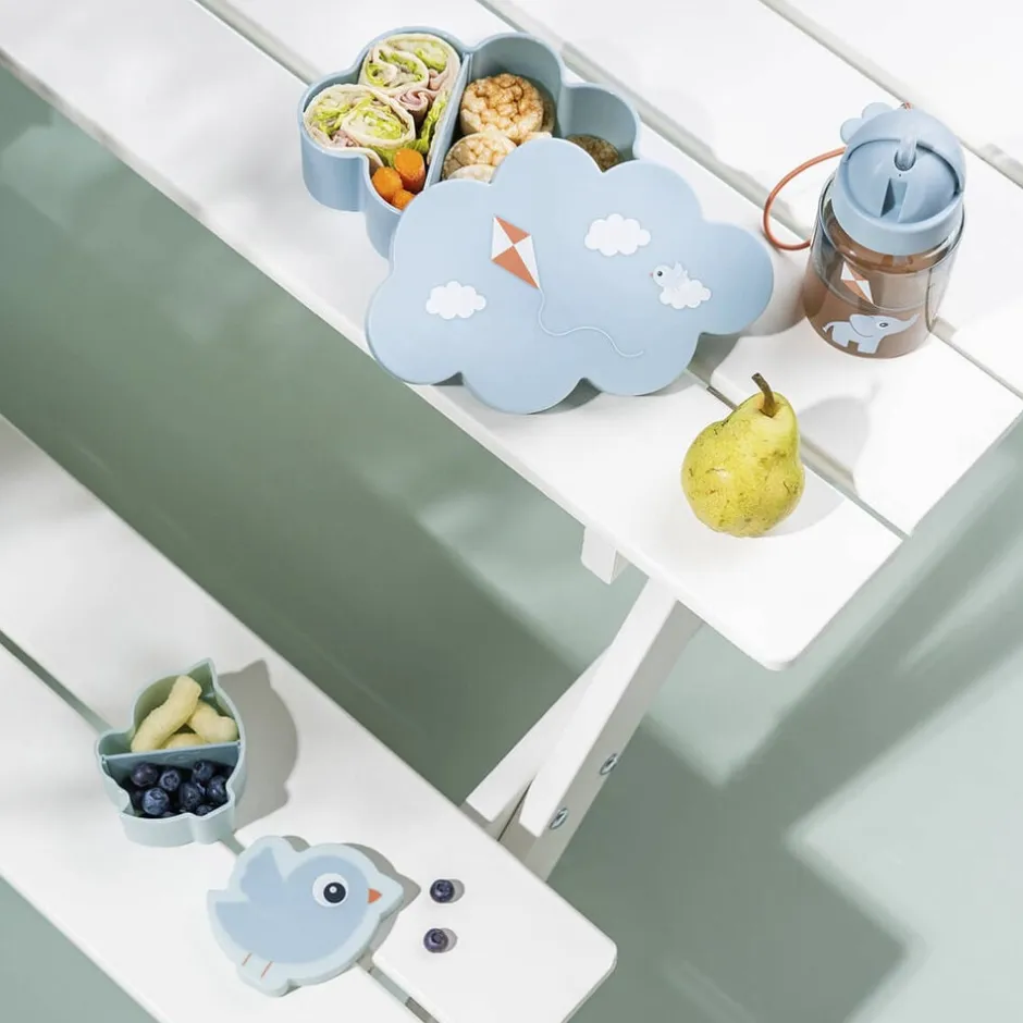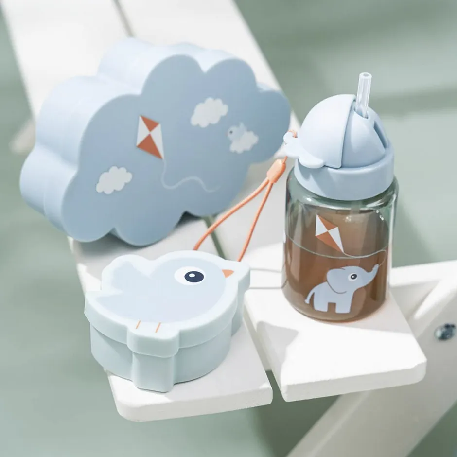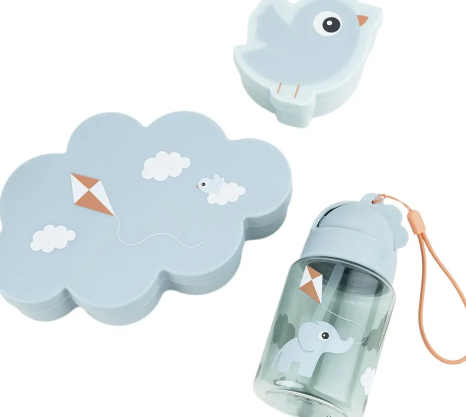 Blåt sæt der indeholder drikkedunk med sugerør, snackboks og madkasse