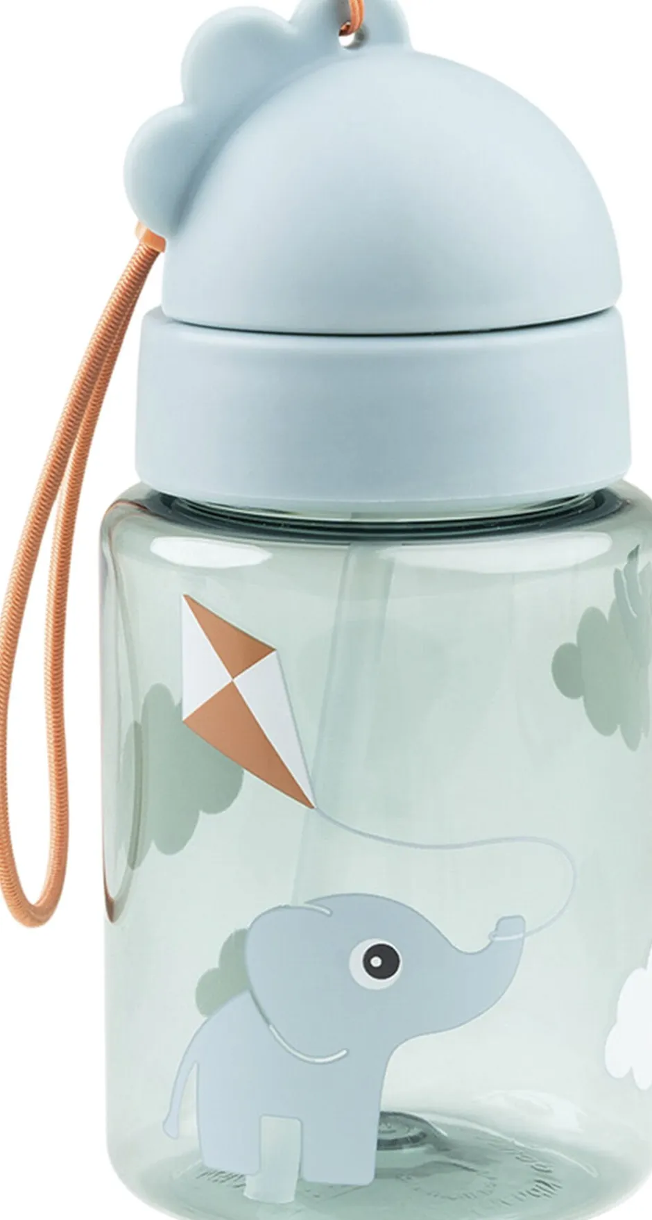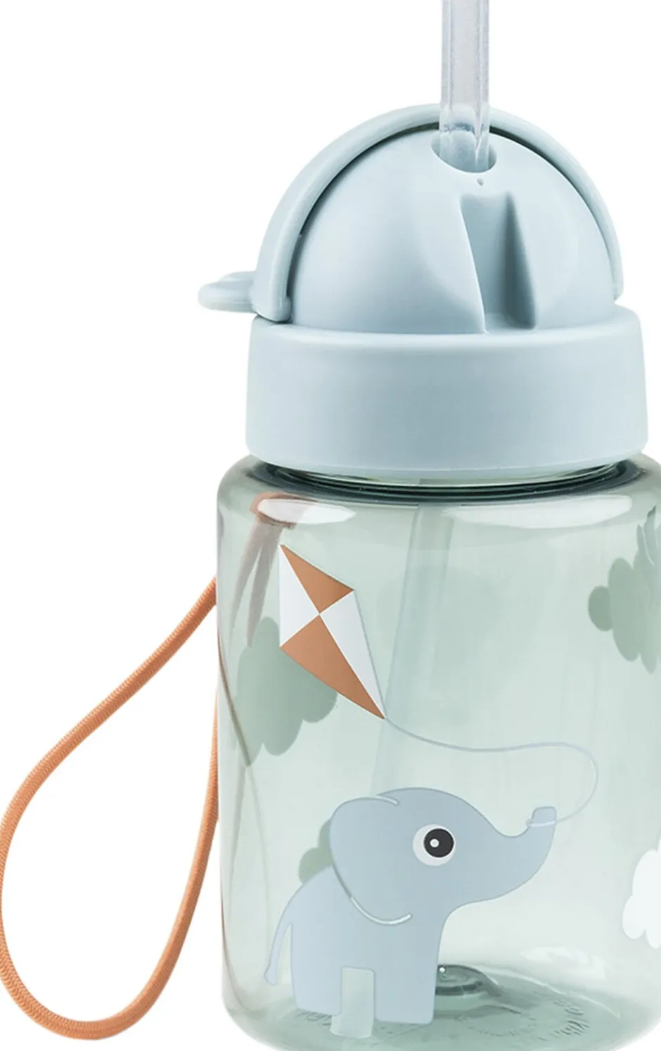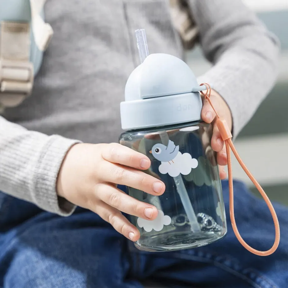 Den gennemsigtige, blå flaske har et praktisk sugerør, der kan foldes ind og forhindrer væske i at løbe ud