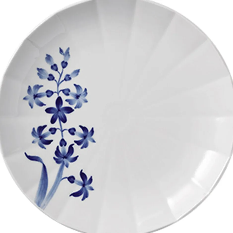 De bedste designs er ofte dem, der ikke ser anstrengte eller komplicerede ud, men derimod lette og tilgængelige. Med blomst-serien har designerne brudt med den mere traditionelle, centralt placerede buketdekoration fra Blå blomst. I stedet er alle elementer hver i sær prydet med deres egen individuelle, unikke blomst, for at opnå et mere moderne og underspillet udtryk. Tallerkenens bløde coupe-form tillader det håndmalede blomstermotiv plads til at gro frit, og den klare blå, asymmetrisk-placerede blomst står i kontrast til den hvide overflade. Uhindret af grænser og ydre kanter synes blomsterne næsten at vokse ind på tallerkenen og fremtræder dynamiske og livlige.