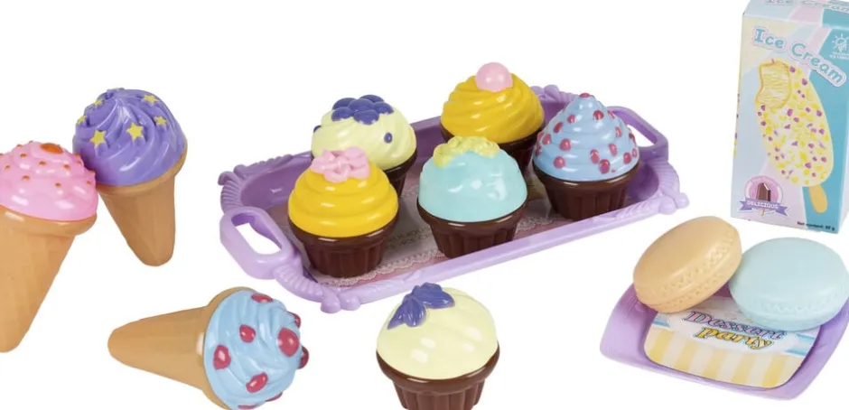 Legemadsdessertsæt Med 6 muffins. 3 isvafler, 2 macarons, serveringsbakke, tallerken og isæske Muffinstoppe og iskugler kan tages af