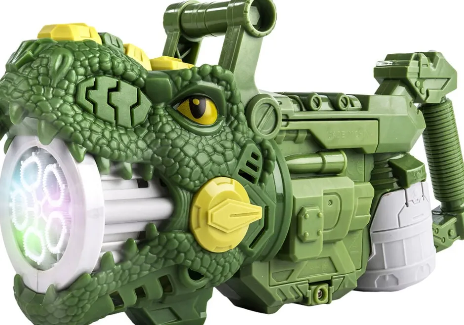 Batteridrevet dinosaur-sæbeboblepistol med lys. Inkl. flaske med sæbeboblevand. Ekskl. 4 stk. AA-batterier.