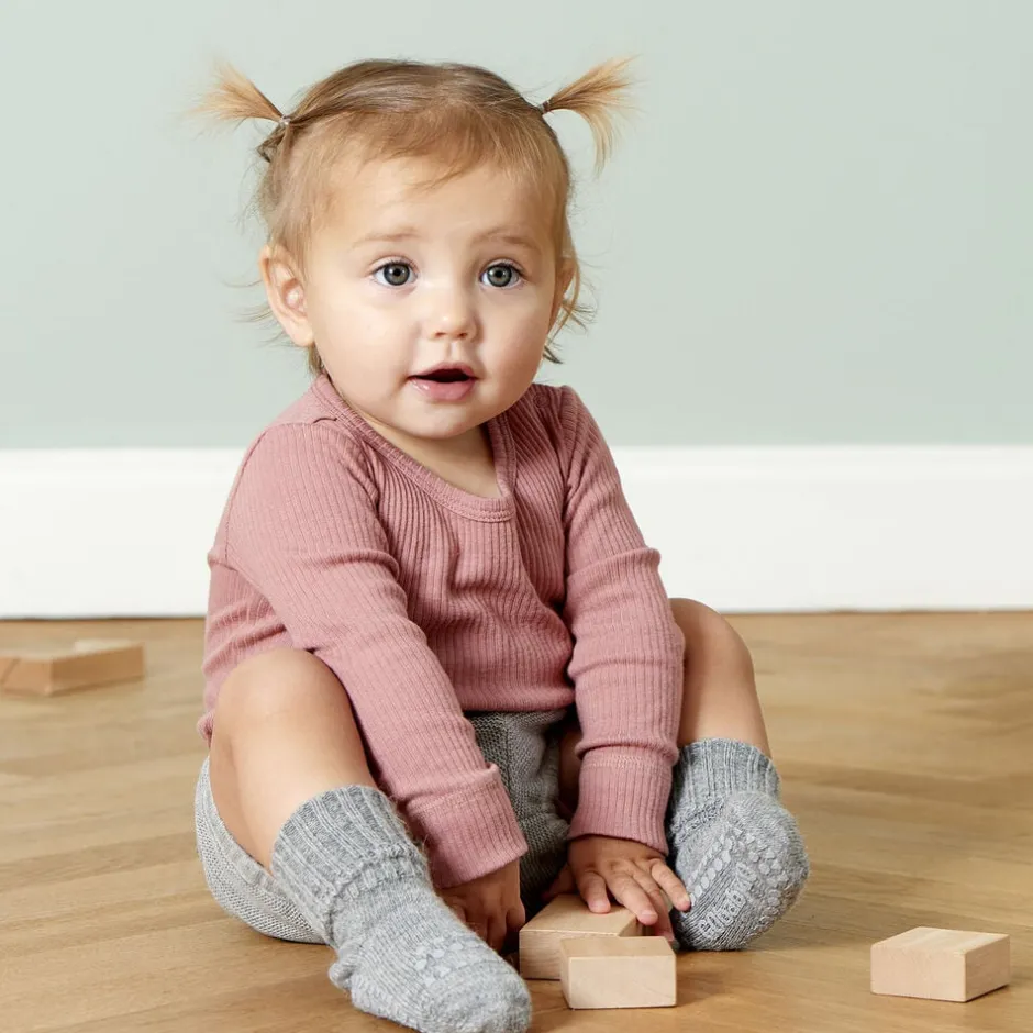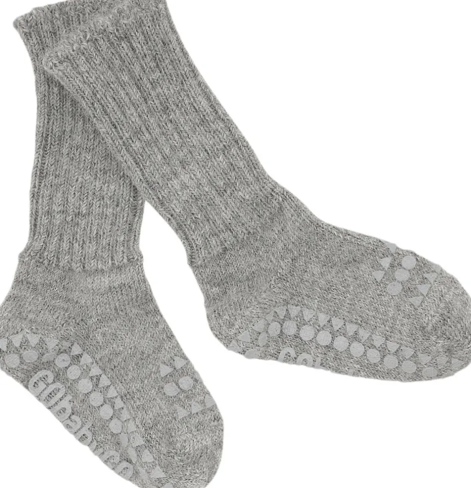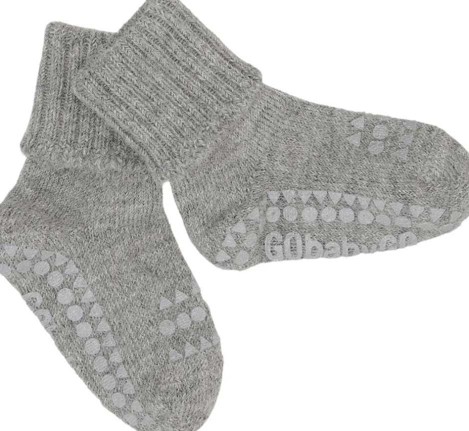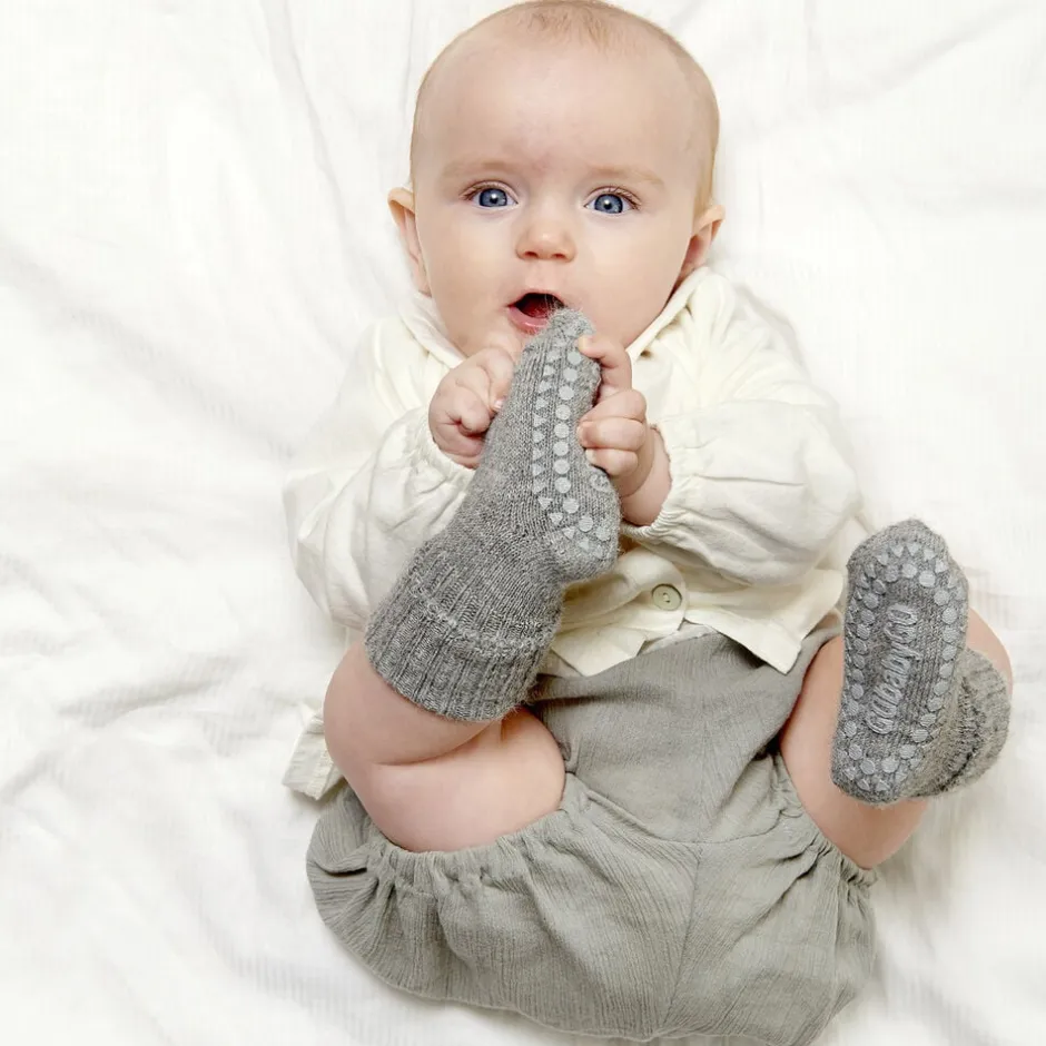 Der findes ikke noget bedre end et par bløde og varme alpaca sokker. Alpaca ulden er kendt som en luksuriøs uld, som giver velvære til fødderne, da det er let at ånde i på trods af den store varmeevne. GoBabyGo skridsikre strømper i alpaca uld med gummidutter under fødderne og ovenpå tæerne, sikrer at dit barn ikke glider på glatte overflader når det skal i gang med at kravle og gå, samtidig med at alpaca ulden holder barnets fødder varme og tørre. Fordele:Gummi dutter under fødderne og ovenpå tæerne giver stabilitet på glatte overfladerStyrker barnets motorik, balance og selvsikkerhedLavet i tykt, lækkert og åndbart Alpaca uldAlpaca ulden holder dit barns fødder varme og tørreTestet og godkendt for sundhedsskadelige stofferDansk design produceret i Europa og Oeko-tex Standard 100 CertificeretHvad er Alpaca?Alpaca garn er spundet af uld fra alpacaen, der er i familie med lamaer. Det kan sammenlignes med almindelig uld fra får, men regnes generelt for at være finere. Alpaca er blødt og holdbart garn. Det er varmere end almindeligt uldgarn og kradser mindre. Det indeholder ikke lanolin og anses dermed for at være mere allergivenligt. Det er mere vandafvisende end mange andre garntyper og er mindre brændbart. Alpaca strømper kan bruges hele året, da lommerne i fibrene giver mulighed for at ånde i dem selv på varme dage. Det er ikke nødvendigt at vaske strømperne så ofte som andre uldtyper, da ulden er selvrensende og oftest blot har brug for frisk luft. GoBabyGo skridsikre strømper i alpaca er testet og godkendt for sundhedsskadelige stoffer og er Oeko-tex Standard 100 Certificeret. Oeko-Tex Standard 100 er en garanti for, at varen er kontrolleret for indhold af sundhedsskadelige kemikalier og der kun er brugt human-økologiske tekstilvarer, som ikke har skadelig effekt på menneskers sundhed og helbred. De skridsikre silikone dutter er også godkendt af denne standard. Produktinformation Materiale: 94% Alpaca, 5% Polyamide, 1% Elastane Størrelser: 6-12 måneder &: 1-2årDe skridsikre gummidutter er lavet af silikone og er fri for ftalater Vask på vrangen