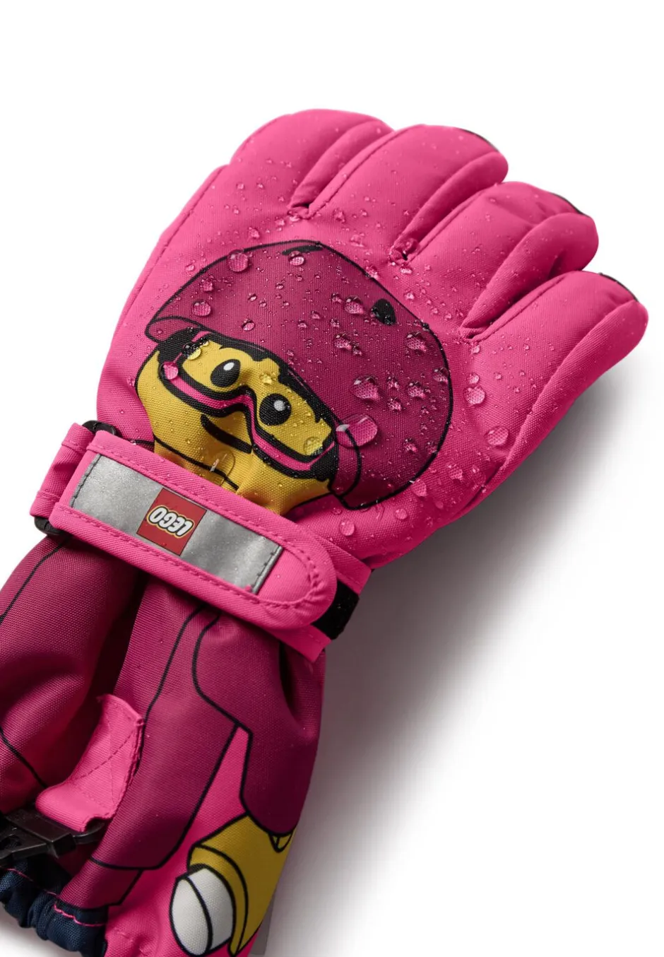 Disse LEGO® ski handsker er designet til at holde små hænder varme og tørre, mens ungerne leger udendørs, til hverdag såvel som på skiferien. Med et sjovt print på fronten af en LEGO minifigur med skihjelm og -briller på er handskerne både funktionelle og har et skægt udtryk.