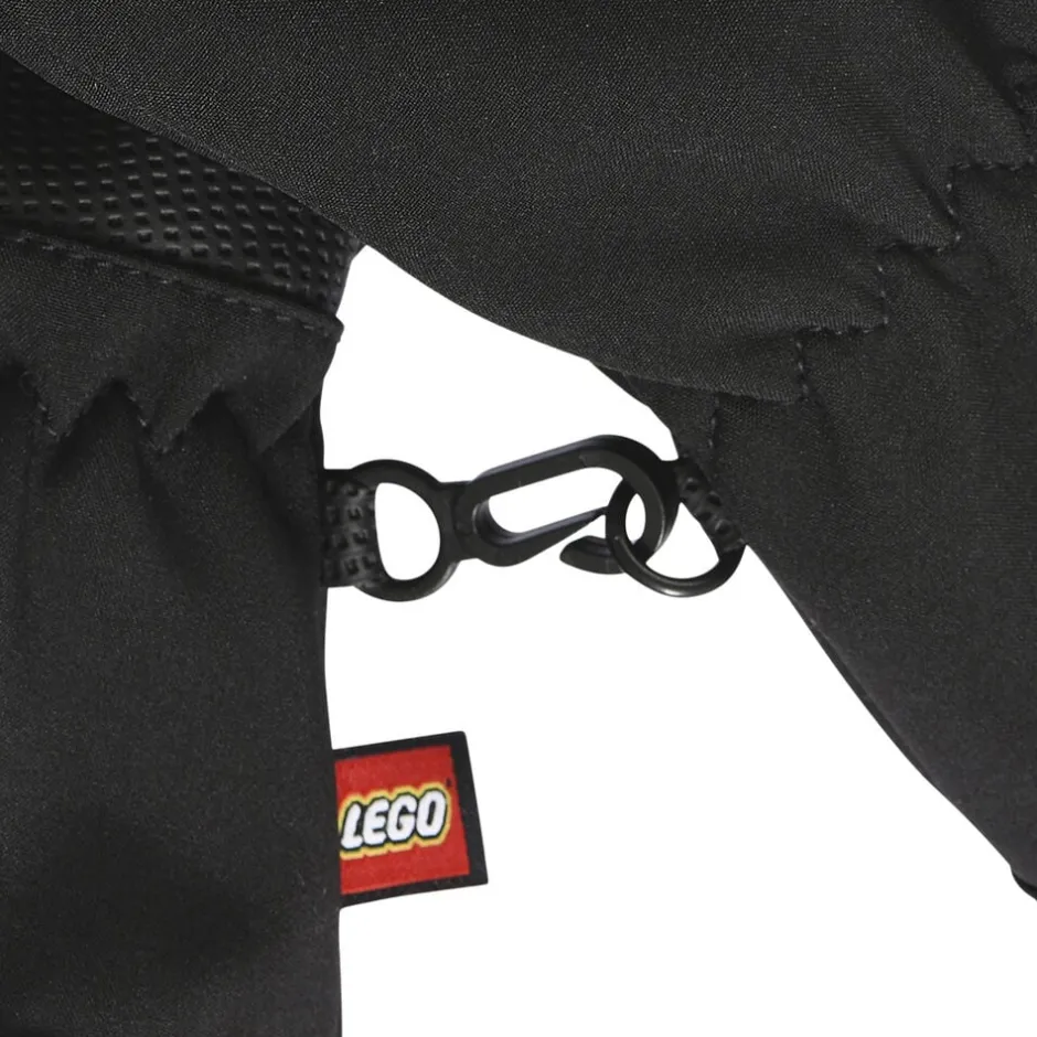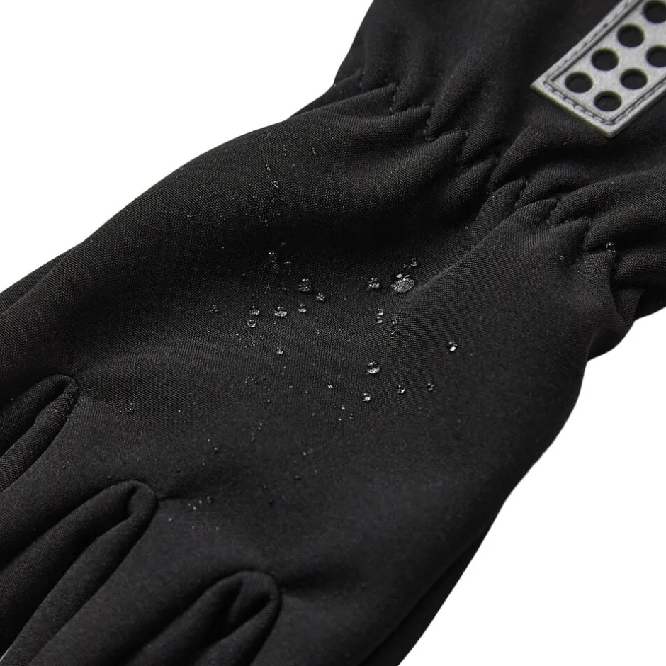 Vandafvisende sorte LEGO softshellhandsker til børn. Ved håndleddet er der en elastik, så handskerne sidder behageligt, og på forsiden er der en LEGO klods formet refleks. Børne softhell handskerne har et vandsøjletryk på 8.000 mm og er åndbare og vindtætte. I håndfladen er der en PU-coating for et bedre greb. Med en fluorfri imprægnering.