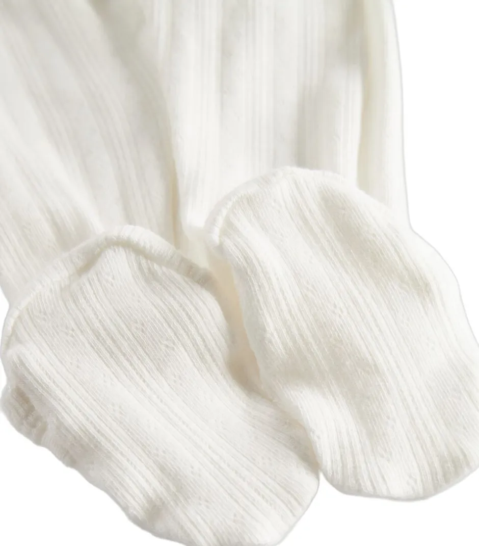 Langærmet pointelle heldragt med fødder til nyfødte. Heldragten har slå-om-lukning, picotkanter og lukkes med trykknapper og bindebånd fra halsen og ned langs det ene ben. Heldragten er blød, strækbar og behagelig at have på.