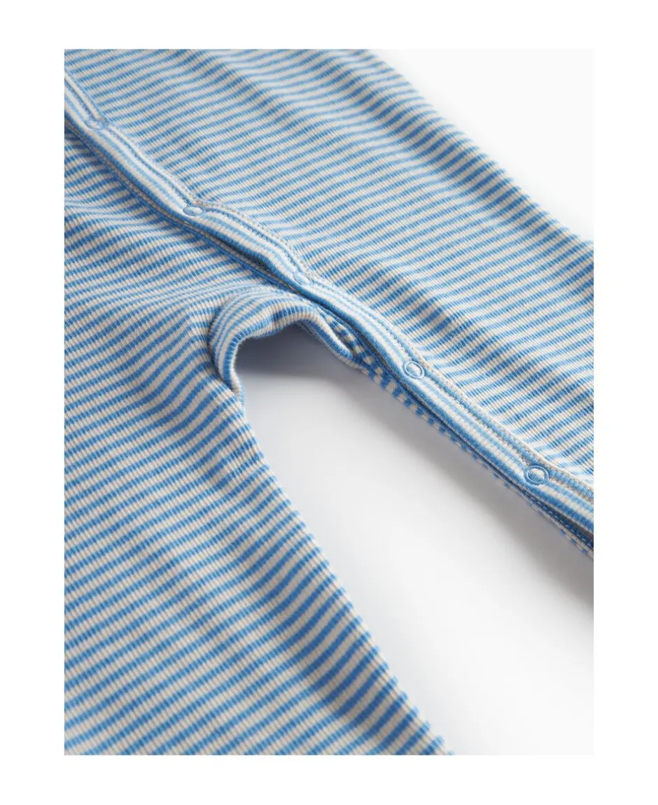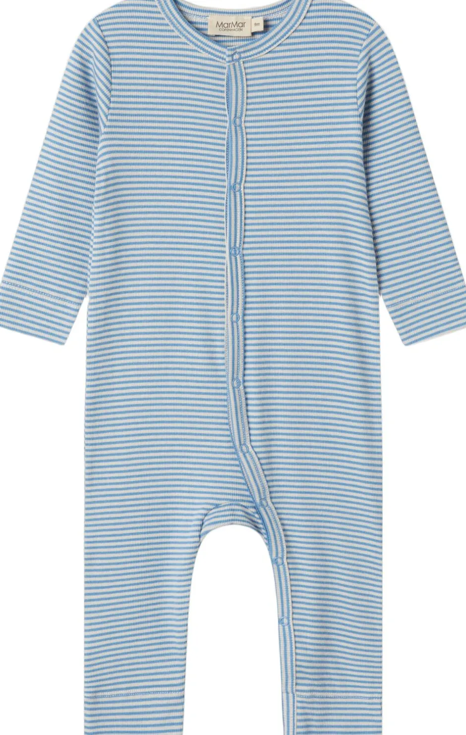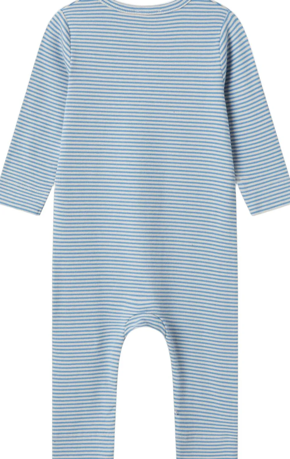 Rummelig baby heldragt med fine striber, trykknaplukning hele vejen fra halsåbning til bukseben. Heldragten kan knappes helt op på det ene ben for nem bleskiftning. Heldragten er både blød, holder form og farve og har elastan i sig som gør den strækbar og behagelig at have på.
