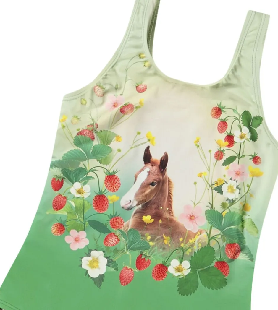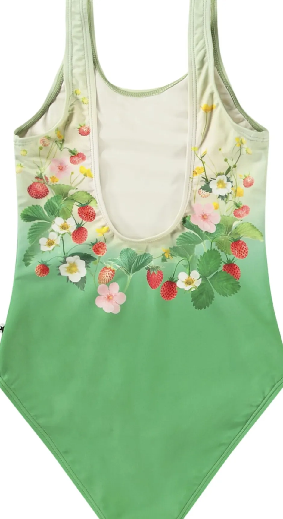 Lyserød badedragt med smilende smiley-print på forsiden. Lavet af genanvendt, elastisk polyester for komfort og nem påklædning. Med en høj UV-beskyttelse på 50+ er den ideel til solbeskyttelse.