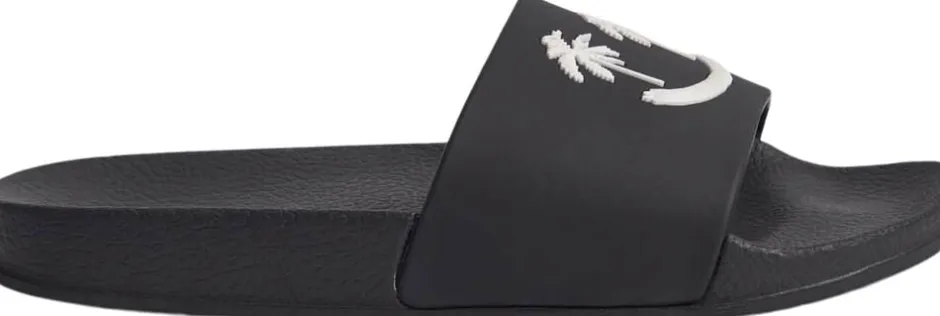 Badesandaler med bred fodrem og formstøbt indersål. Disse sandaler er vandafvisende og ideelle til både poolen og stranden. Fodremmen prydes af et smilende ansigt med palmeøjne.