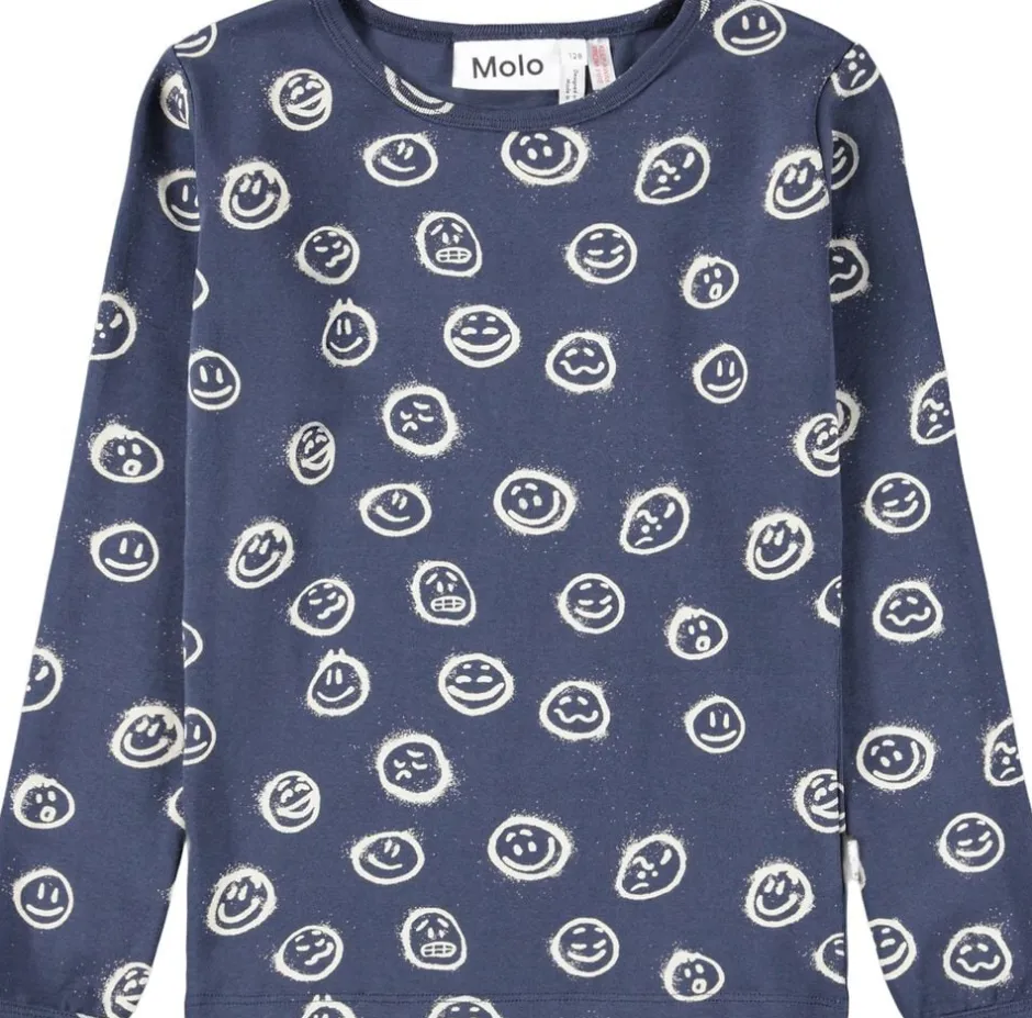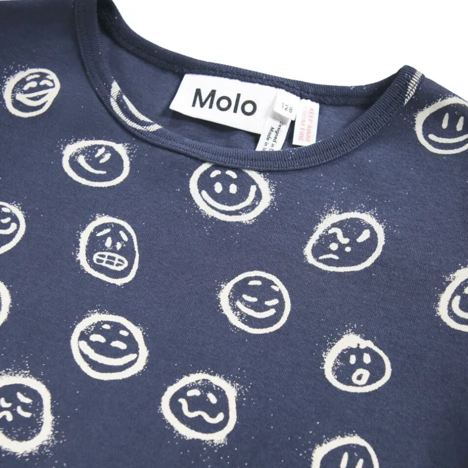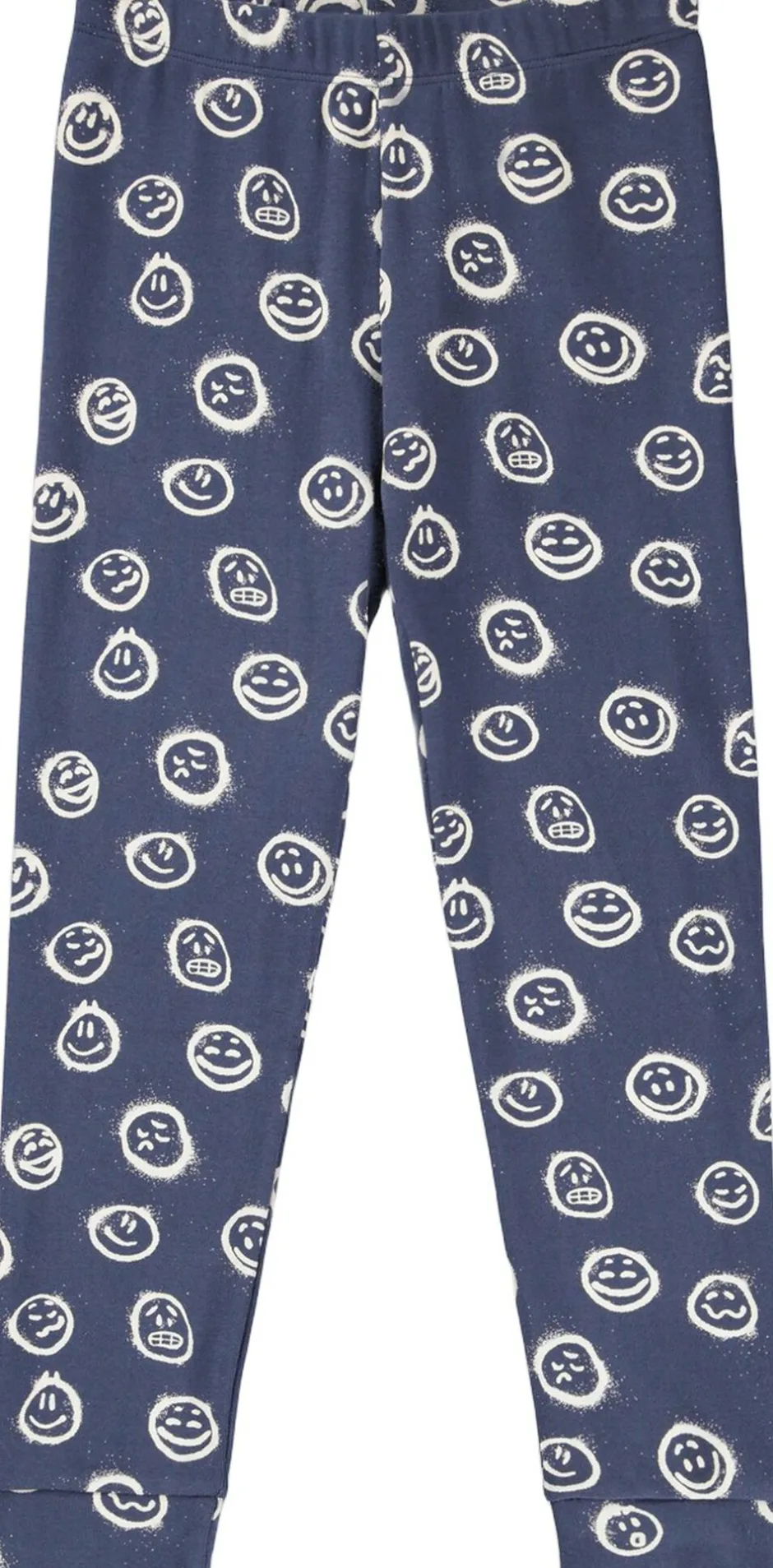 Dette nattøjssæt fra Molo er fremstillet i økologisk bomuld. Bukserne har en elastisk talje og ribkant ved anklerne, mens toppen har en rund halsudskæring og et stort, spraymalet smil i sort som placeret print på fronten.