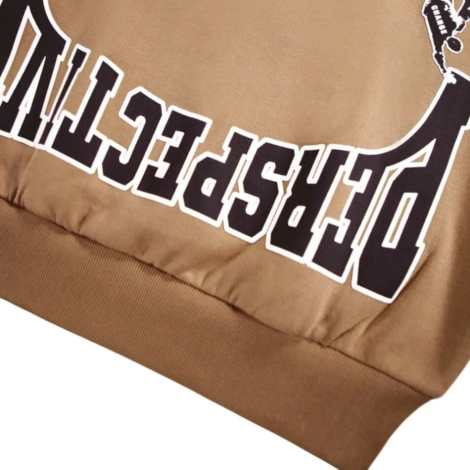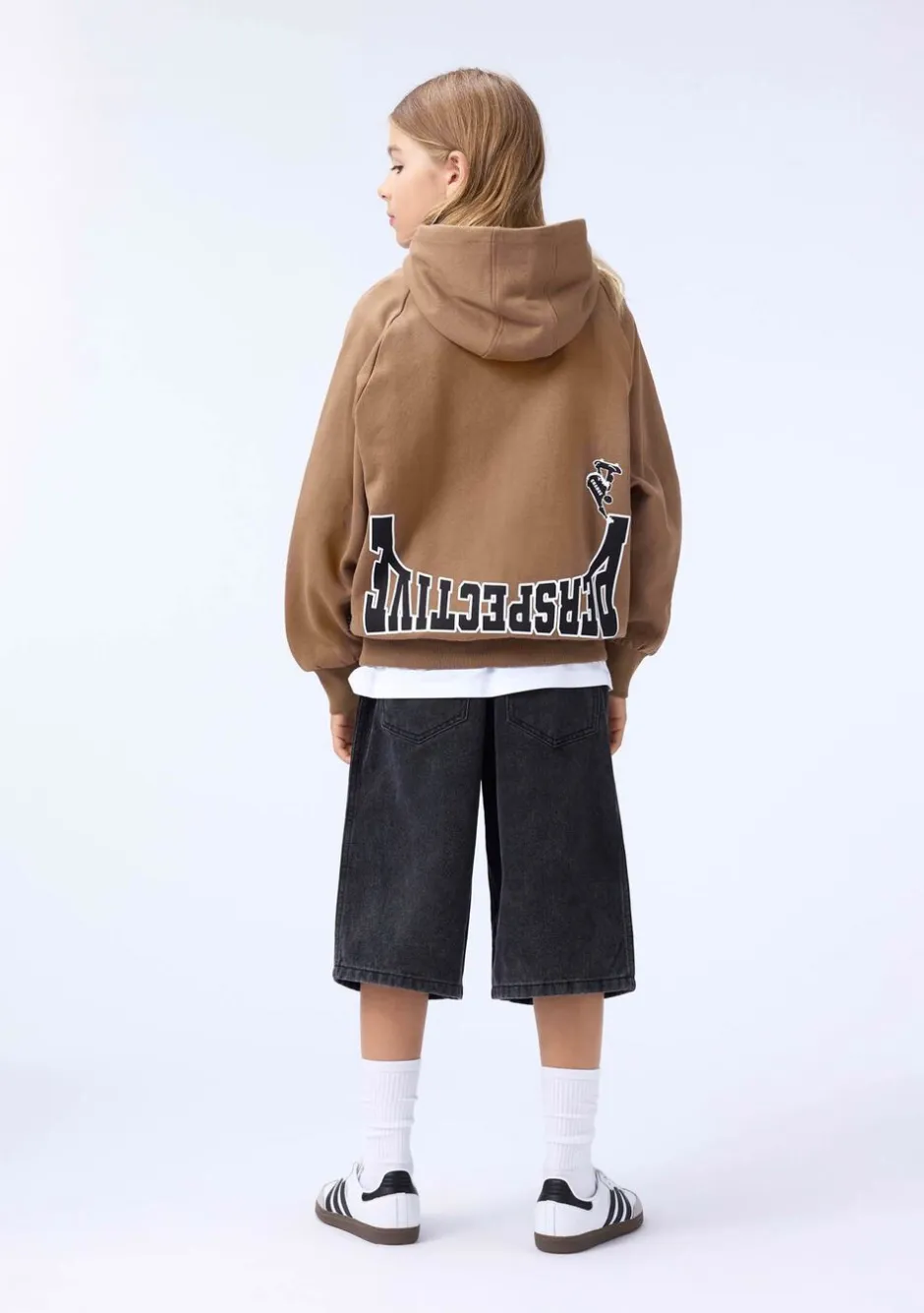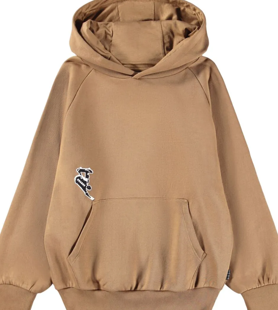 Denne brune hættetrøje fra Molo er fremstillet i økologisk bomuld og har en kængurulomme samt ribkanter ved håndled og hofte. Trøjen har et sort/hvidt print af skatere og teksten ‘Perspective’.