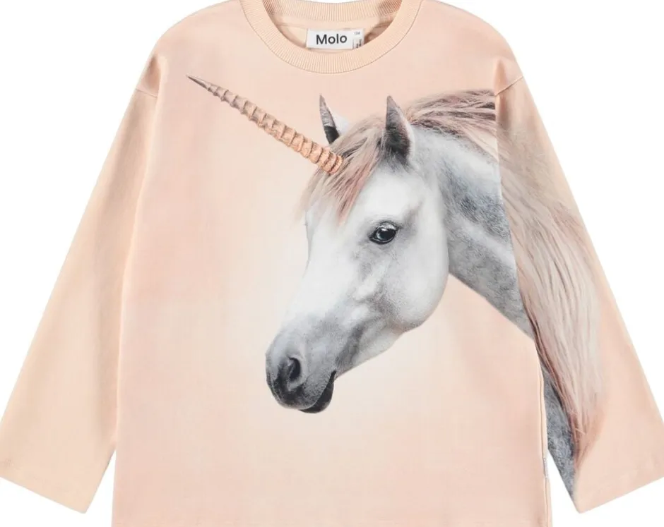 Denne rosa sweatshirt fra Molo er lavet af økologisk bomuld og har en rund halsudskæring med ribkant, lange ærmer og en almindelig pasform. Sweatshirten har et flot stort print af en enhjørning.
