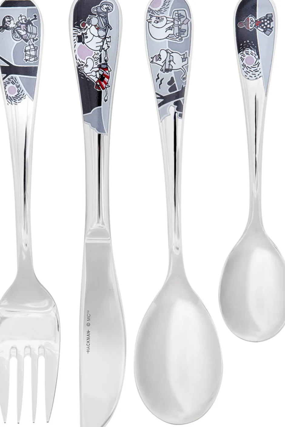 Fint bestiksæt til børn. Bestiksættet består af en gaffel, en kniv, en ske og en teske.