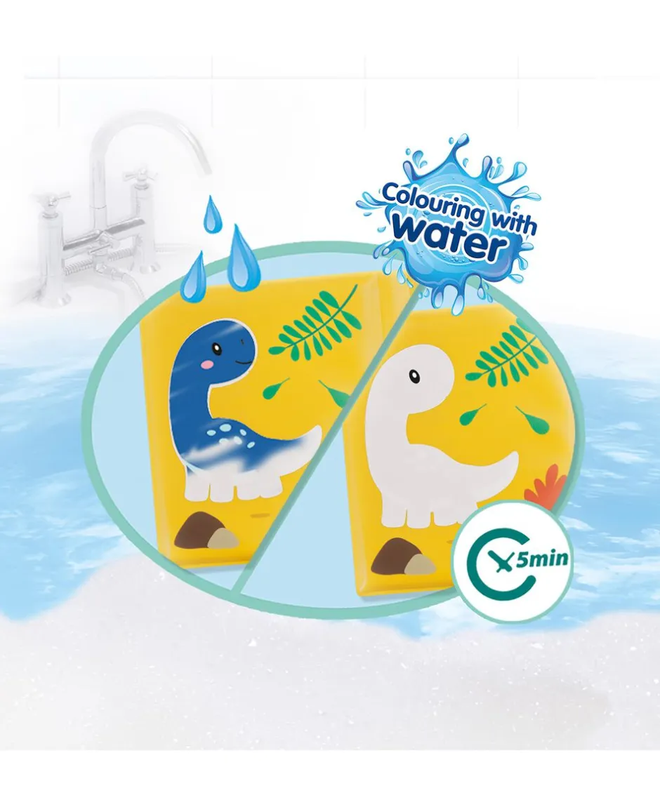 Barnet kan opdage nye dinosaurer på hver af de 8 sider. Efterhånden som siderne bliver våde, bliver dyrene synlige.