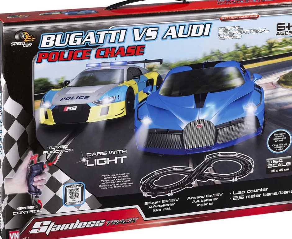 Audi/Bugatti politijagt 8-tals racerbane 1:64 Komplet 2. 5 meters batteribane i god kvalitet i scala 1:64 med Audi- og Bugattibil med lys, håndspeedere med god kontrol og tilbehør Bruger 8 stk AA-batterier