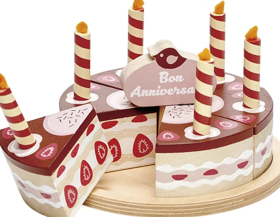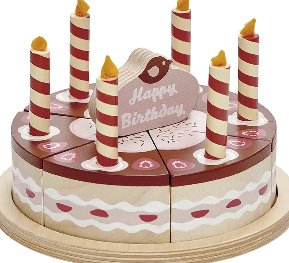 Lagkagen er delt i 6 stykker og leveres på et naturfarvet træfad.