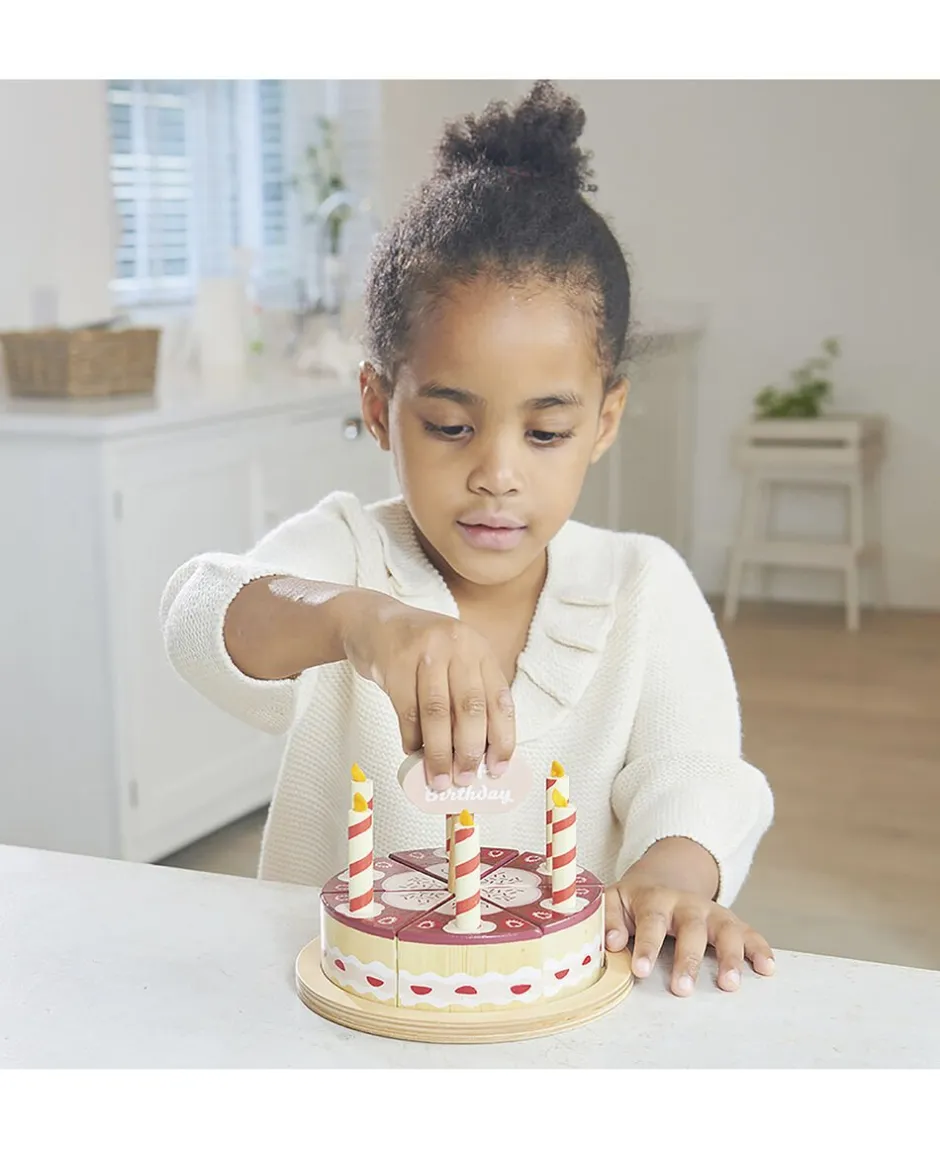 Festlig chokolade fødselsdagslagkage i massivt træ, toppet med 6 stribede lys og et Happy Birthday-skilt i midten.