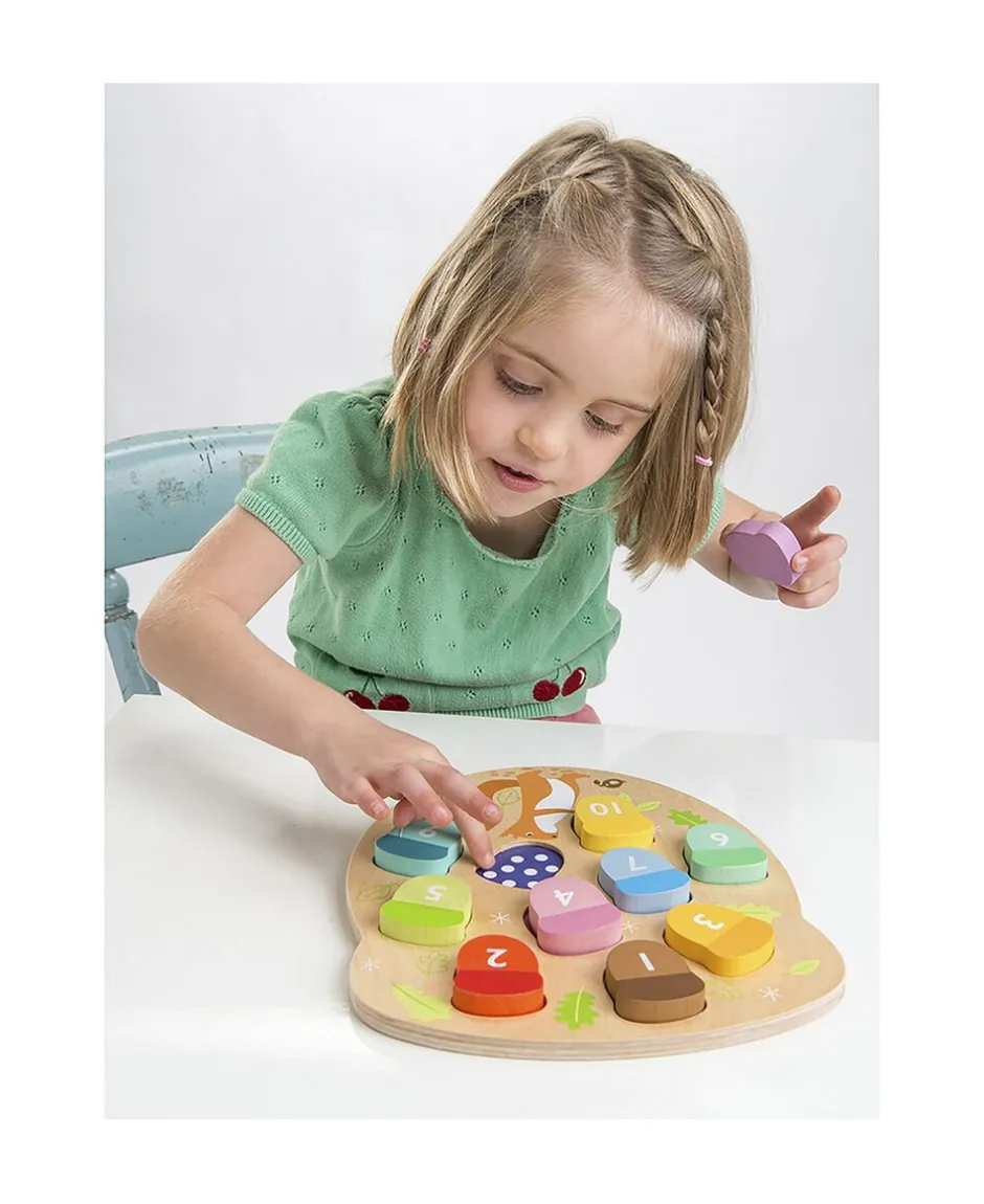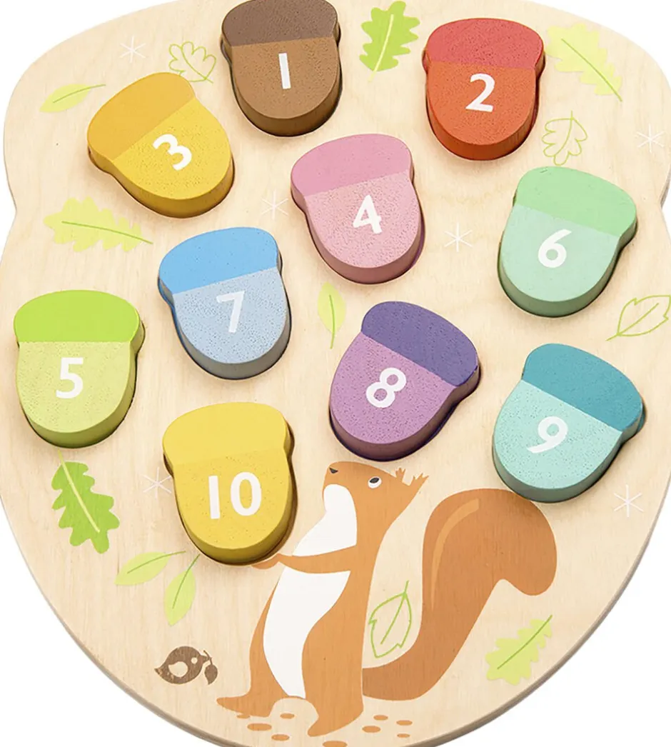 Sættet indeholder 10 farverige agern. Under hvert agern afsløres vises den matchende farve og et antal prikker svarende til tallet på forsiden.