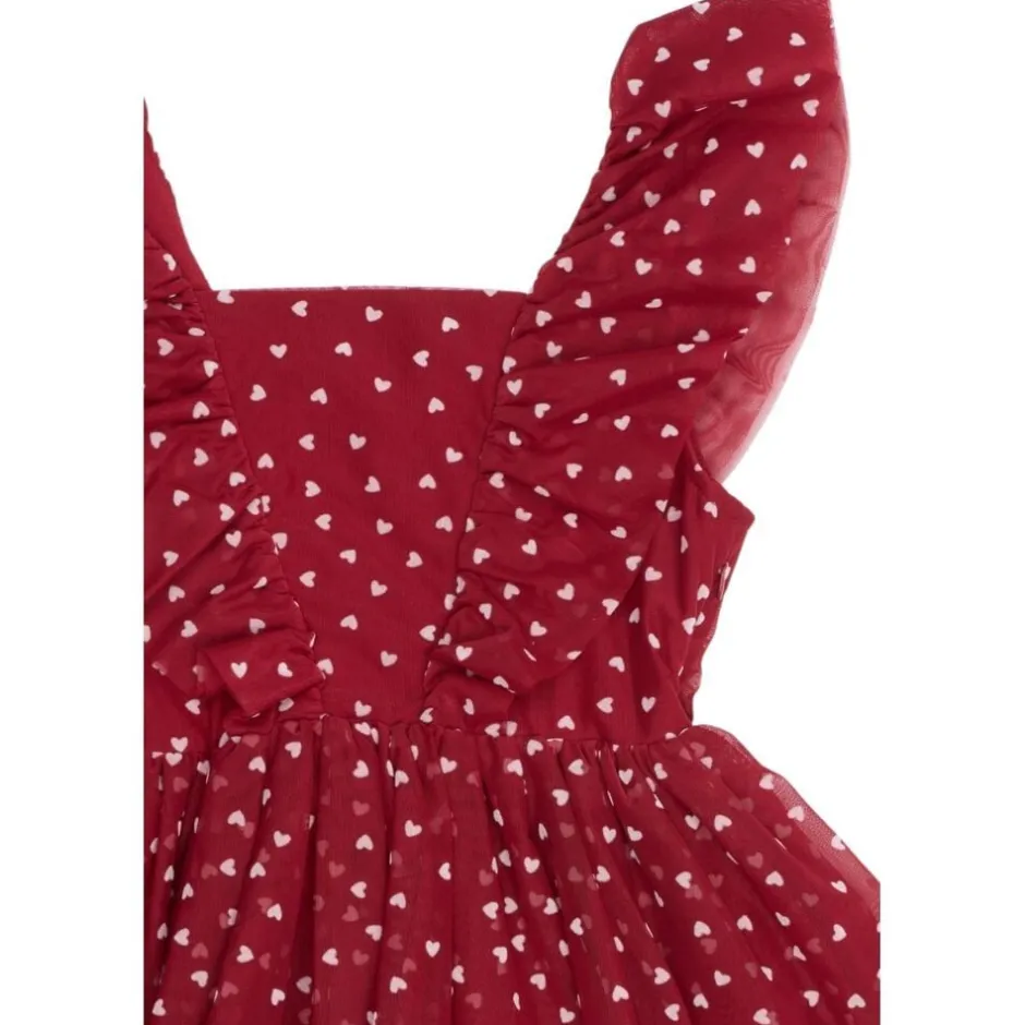 Sød og romantisk kjole fra THE NEW, der emmer af elegance og leg. Kjolen har fine flæsedetaljer ved skuldrene og skørtet, som giver et smukt, voluminøst udtryk. Det lette mesh-stof er dekoreret med små hjerter. Kjolen er opbygget i to lag med blødt og åndbart bomuld på indersiden, samt et ydre lag af blødt, gennemsigtigt mesh-stof. Den har en praktisk lynlås i siden, som gør den nem at tage af og på, og den elastiske talje giver en god og fleksibel pasform. Perfekt til særlige anledninger, hvor der skal lidt ekstra charme til. – Kort kjole med en længde der slutter lige over knæene. – Normal pasform med a-snit og elastisk der fremhæver taljen. – Ærmeløs. – Flæsekant langs stropperne. – Sødt hjerteprint. – Lynlås i siden af kjolen.