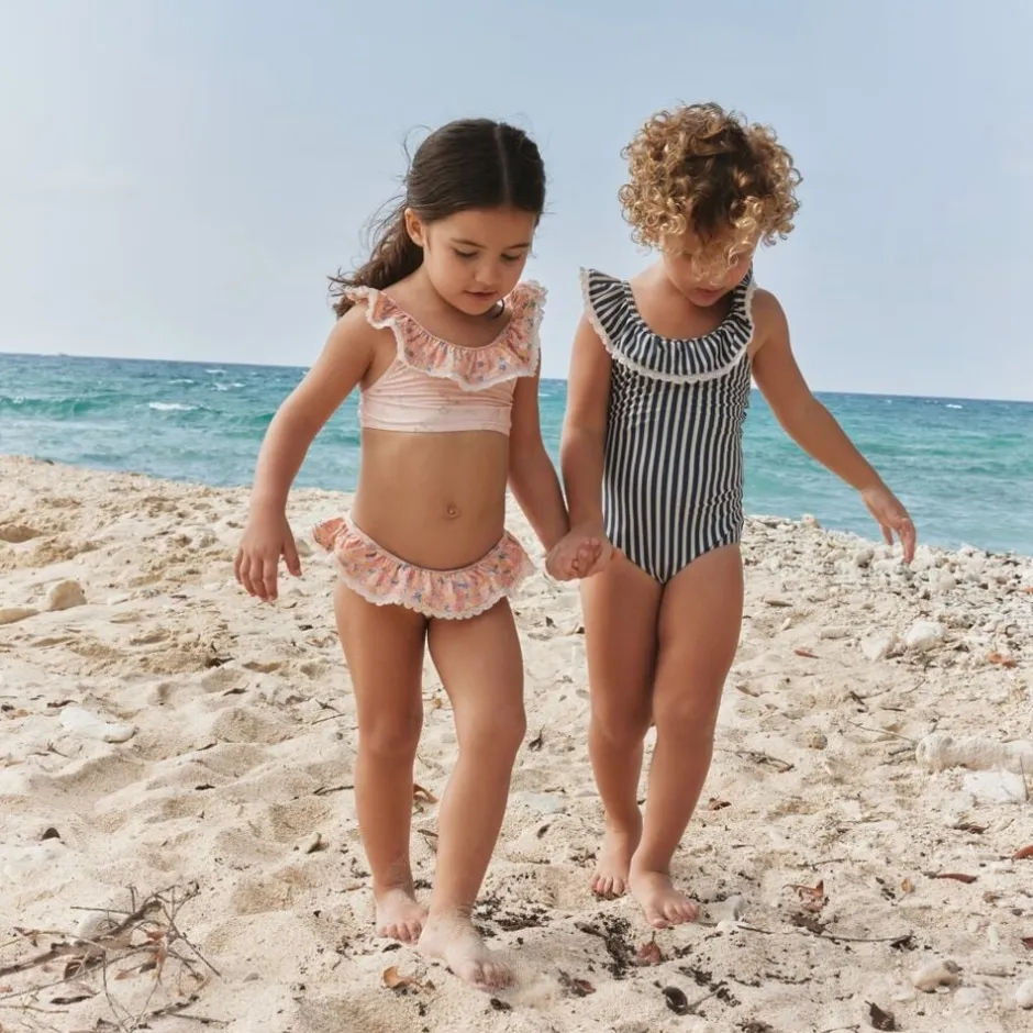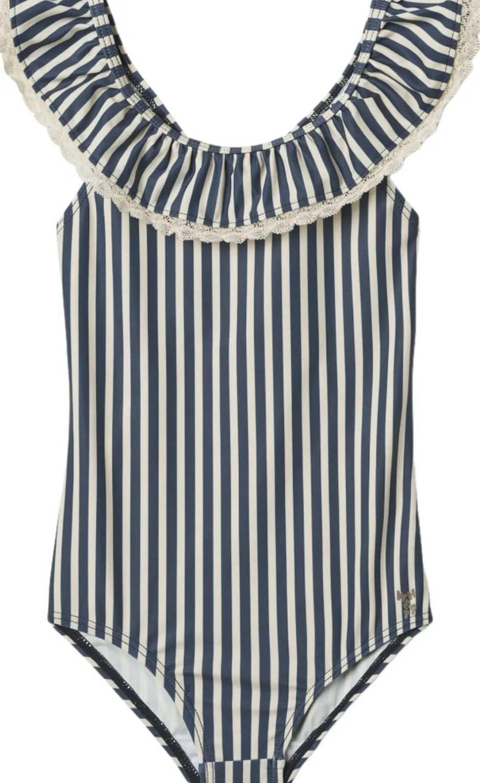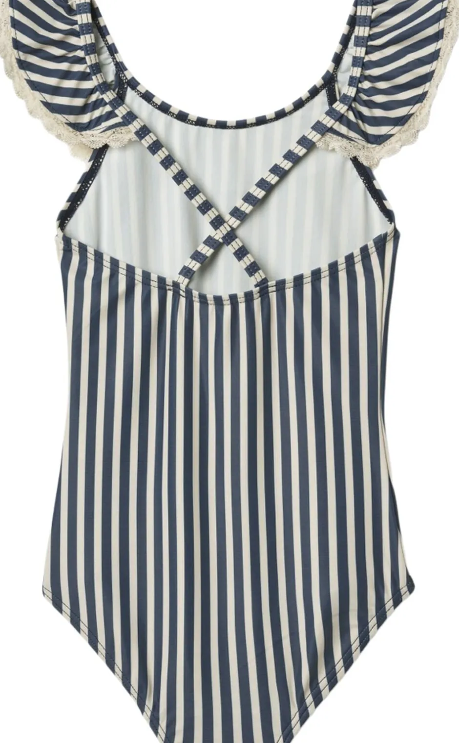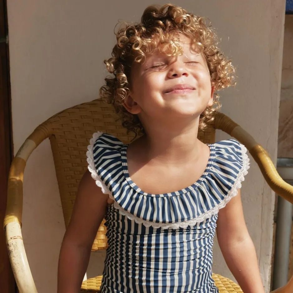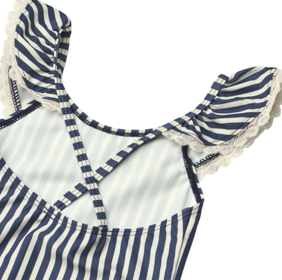 Smuk stribet badedragt med blonder til børn. – Figursyet – Blondedetaljer – Bred flæsekant langs med halsudskæring og skuldre – Dyb ryg – Skulderstropper der krydser på ryggen Wheats badetøj er perfekt til en dag på stranden, ved poolen eller blot til vandleg i haven. Alt vores badetøj er overvejende produceret i genanvendt polyester, og er yderst behageligt for dit barn at have tæt på kroppen. Badedragten har en yndig flæsekant, der gør stylen unik og feminin i sit udtryk. Kombiner badedragten med en let kjole og dit barn er klar til sommerens mange udflugter. Forlæng dit badetøjs levetid: – Ved altid at skylle dit badetøj efter badning i klor- eller saltvand – Ved at følge vaskeanvisningerne — – Standard 100 efter OEKO-TEX® – 83% Genanvendt polyester, 17% Elastan – GRS certificeret
