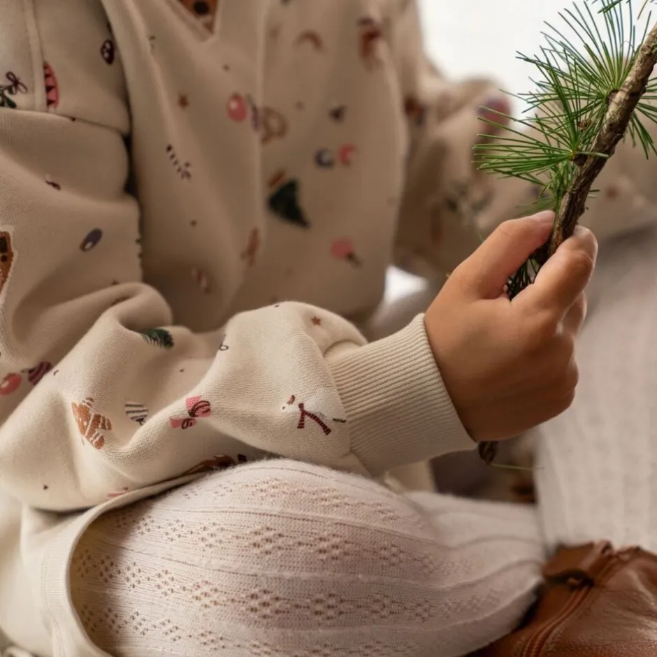 Langærmet sweatkjole i blødt økologisk bomuld til børn. – Løs pasform – Blød rib ved halsudskæring, manchetter og forneden – Lav skuldersøm – Bærestykke ved hoften – Ekstra stof som nederdel – Wheat signatur juleprint Wheats søde kjole har en løs pasform, som gør den nem og behagelig for dit barn at have på. Kjolen er perfekt til efterårs- og vintermånederne og kan styles med bløde strømpebukser og en cardigan eller strik udover. — – Standard 100 by OEKO-TEX® – 100% Økologisk bomuld – GOTS certificeret