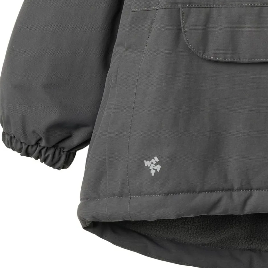 Bestseller jakke i anorak-look til din baby. – Normal pasform – Foret med blødt fleece på kroppen – Polyesterfor: Indvendigt i hætte og ærmer – Aftagelig og justerbar hætte med rib – Ribkrave – Skjult dobbelt lynlåse foran – Brystlomme med lommeklap – Elastik i manchetter – Reflekser Wheat’s jakke er lavet i åndbart, vind- og vandtæt materiale, og er perfekt til de mange kolde efterårs- og vinterdage. Den er designet med høj performance og komfort for øje, da materialet er slidstærkt og smudsafvisende og derfor nemt at rengøre og vedligeholde. Denne tekniske jakke er tænkt som en vinterjakke, da den har fleecefor og er lavet til at holde dit barn varm hele dagen lang. — Vandsøjletryk: 10. 000 mm Åndbarhed: 8. 000 g/m2/24 timer Slidstyrke: 50. 000 mm PFC-fri Fluorfri vand- og smudsafvisende finish (BIONIC FINISH ECO) Teknisk letvægts isolationsmateriale Tapede sømme GRS-certificeret — Standard 100 by OEKO-TEX® Yder materiale: 100% Genanvendt nylon Polstring: 100% Genanvendt polyester Fleecefor: 100% Genanvendt polyester For: 100% Genanvendt polyester