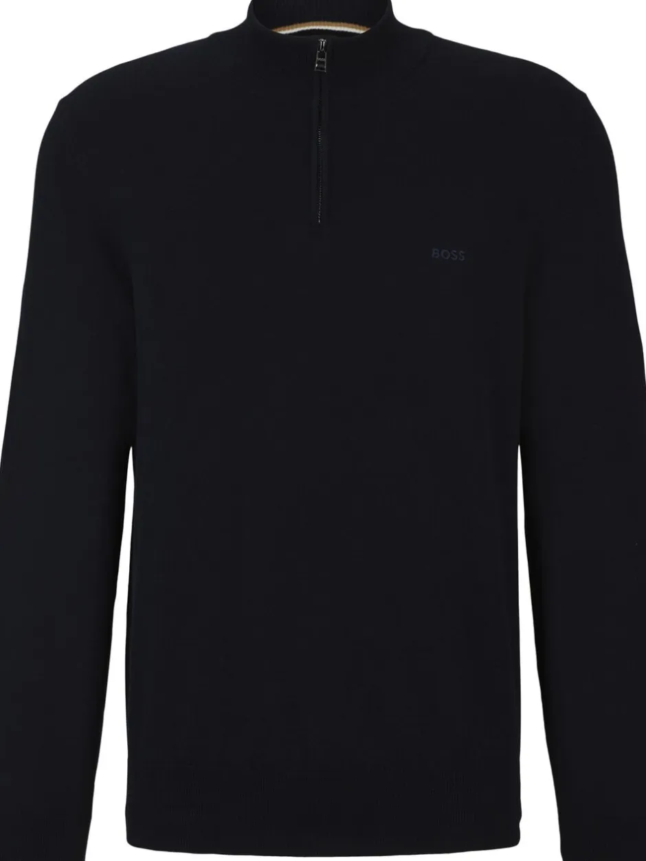 En elegant sweater med lynlåshals fra BOSS. Denne beklædningsgenstand er strikket i blødt garn og broderet med et BOSS-logo på brystet. Dette produkt er fremstillet af økologisk bomuld. Vores økologiske standarder tillader ikke brug af syntetisk gødning, pesticider eller genetisk modificerede frø.
