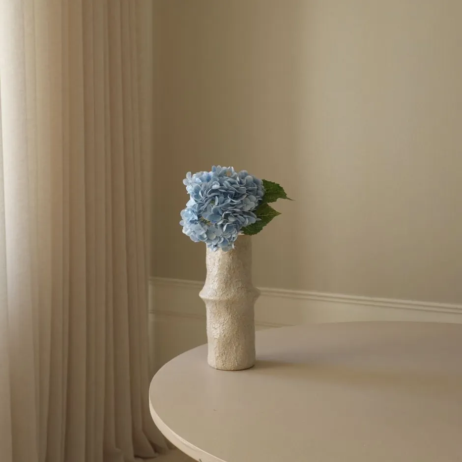 Denne Light Blue Hydrangea Flower stem har en Single, afrundet blomst bestående af adskillige delikate kronblade i bløde blå nuancer med subtile variationer i tone. Kranserne har en glat tekstur, og blomsten ledsages af to teksturerede grønne blade med fremtrædende årer. Blomsten er fastgjort til en robust, grøn stilk og når en højde på 49 cm. Den store keramiske jordvase på billedet måler 30,5 cm i højden og 10 cm i diameter.
