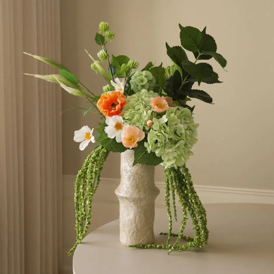 Denne Orange Large Poppy Flower har en Single åben blomst med delikate, let rynkede kronblade i en dyb orange nuance med diskrete variationer i tone. Midten er mørk, i kontrast til de lysere kanter af kronbladene. Blomsten ledsages af en delvist åbnet knop og detaljerede grønne blade med en savtakket tekstur. Blomsterne er arrangeret på en blødt buet grøn stilk, som måler 60 cm i højden. Den store keramiske jordvase på billedet måler 30,5 cm i højden og 10 cm i diameter.