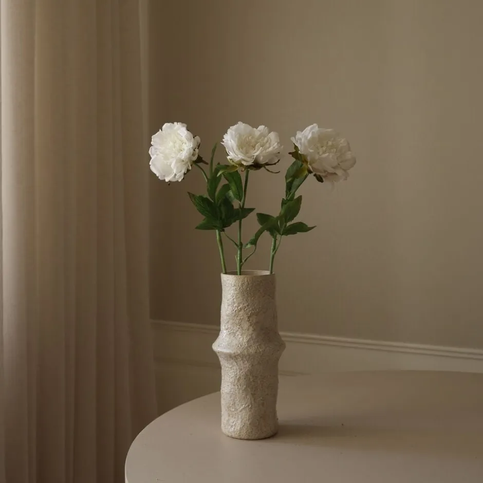 Denne White Peony Flower har lagdelte hvide kronblade med bløde Creme i bunden, hvilket skaber en fuld, afrundet blomst. Den slanke grønne stilk har en naturlig kurve og fremhæves af teksturerede grønne blade. Stemmen måler 56 cm i højden. Den store keramiske jordvase på billedet måler 30,5 cm i højden og 10 cm i diameter.