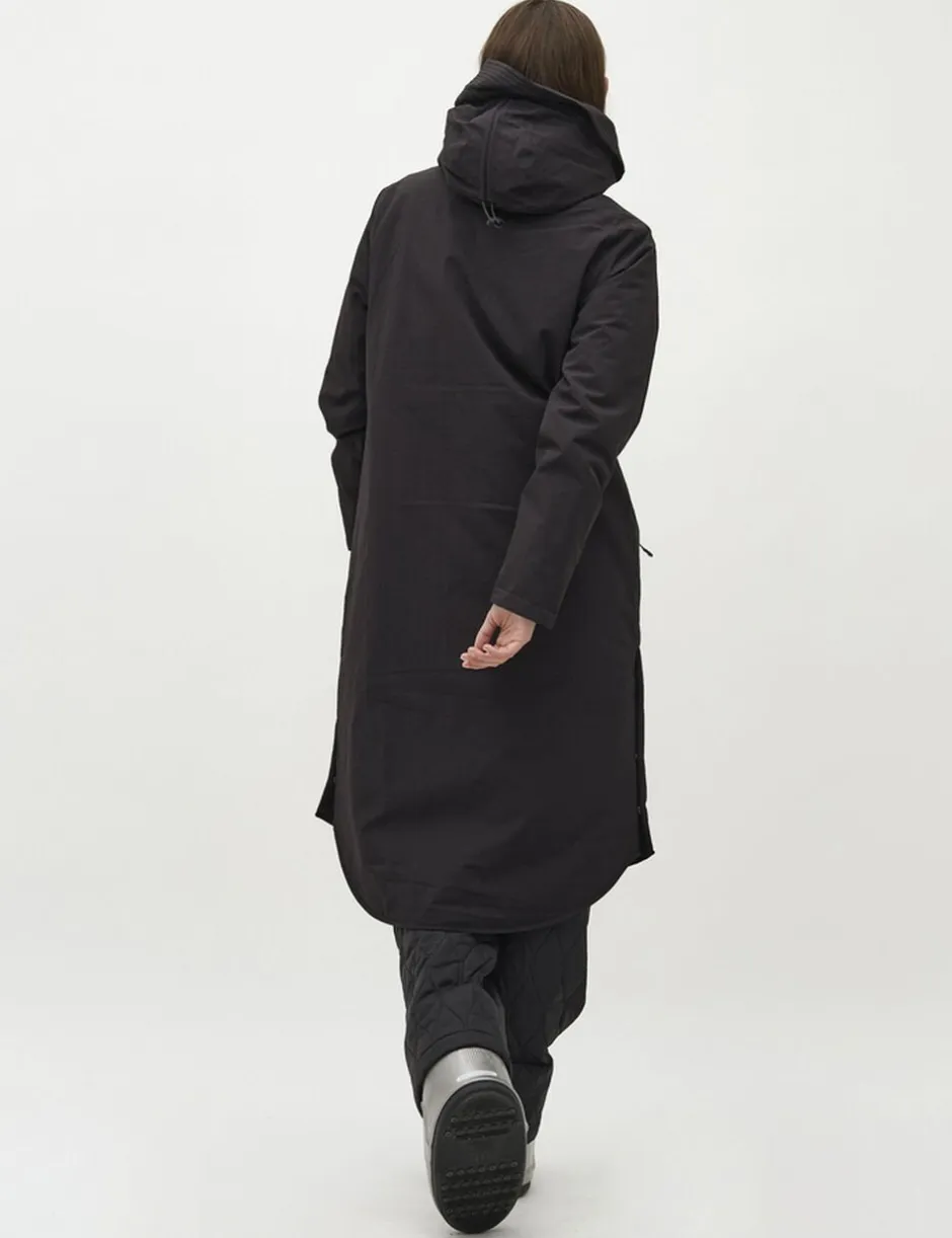 Jakken går til omkring knæene, har en gennemgående lynlås og rumlige lommer.