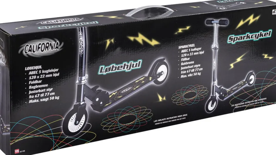 California sort løbehjul. 120×22 mm hjul ABEC 5 kuglelejer Slide lock-foldemekanisme Justerbart styr fra 65-75 cm Håndtag i EVA-skum Bagbremse Kan bære 50 kg