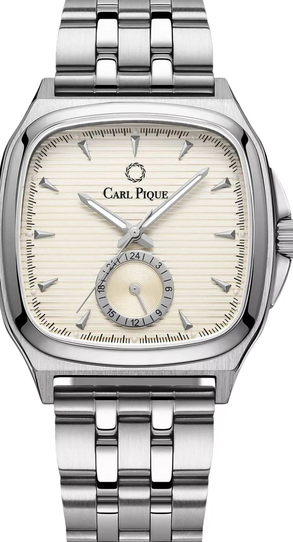 Carl Pique Carré CP0009 skiller sig ud med sin firkantede urkasse og blødt afrundede kanter, hvilket giver et moderne udseende. Urskiven har et tekstureret mønster, der tilføjer dybde til designet. Nederst på urskiven er der en lille kronograf, der forbedrer det visuelle indtryk. Den beige urskive er indrammet af en sølvfarvet urkasse og bezel, suppleret af en sølvfarvet stål-lænke. Butterfly låsen sikrer en sikker pasform.