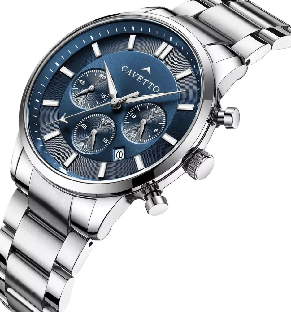 Cavetto Pantheon CV0002 er et ur, der kombinerer funktionalitet med et stilrent design. Med en diameter på 42 mm gør det et stærkt indtryk på håndleddet. Den runde urkasse har en metallisk finish, med en blå urskive, der tilføjer et strejf af elegance. Urskiven inkluderer tre kronografer, der tilbyder en praktisk og visuelt tiltalende detalje. Enkle lineære markører giver et rent udseende, som komplementeres af den sølvfarvede urkasse og bezel.