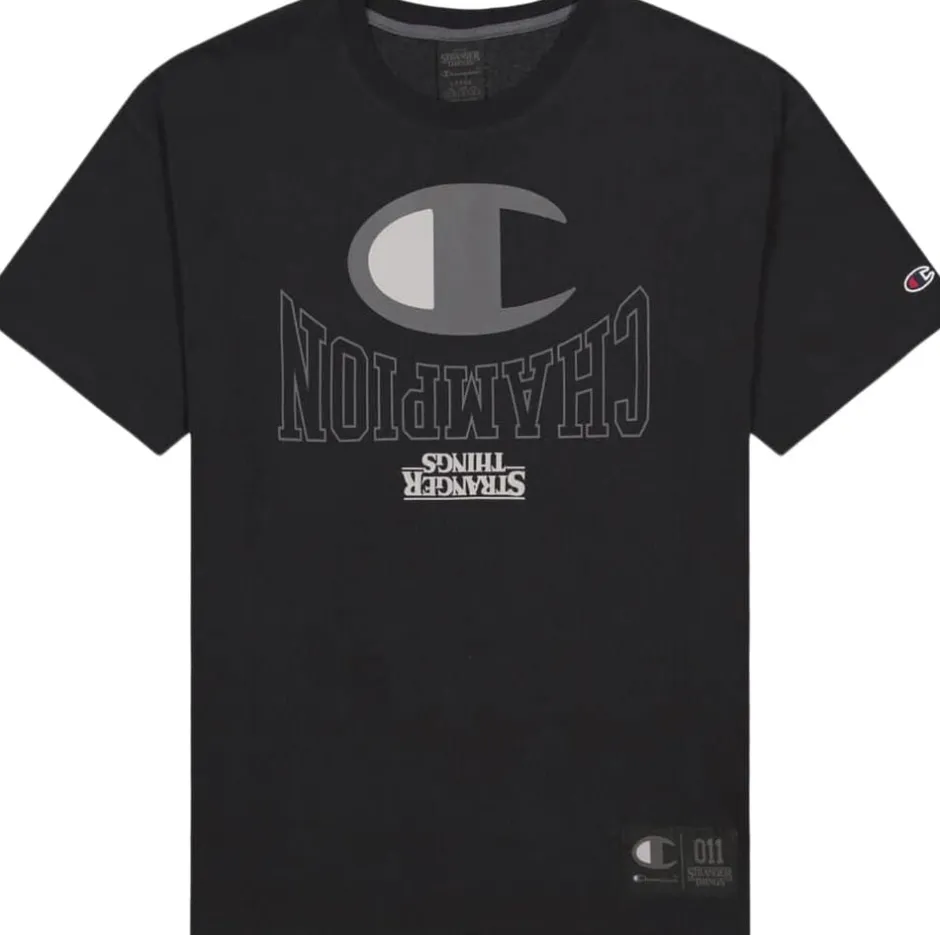 Denne T-shirt har fået et Champion logo og Champion skrift på hovedet, samt Stranger Things logoet.